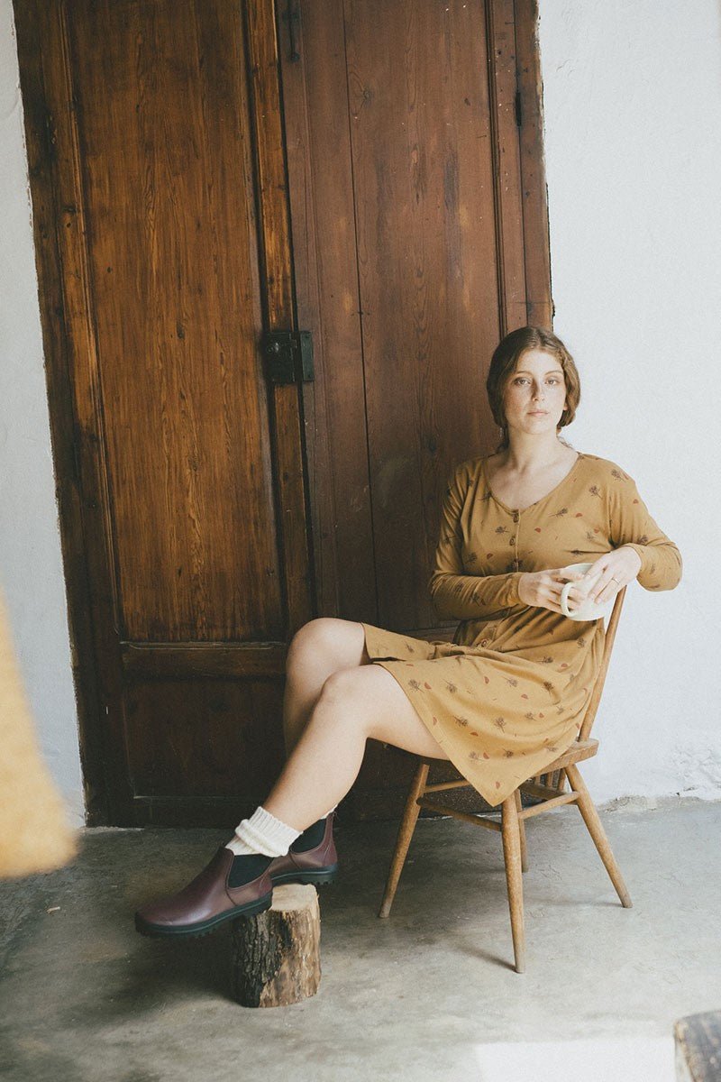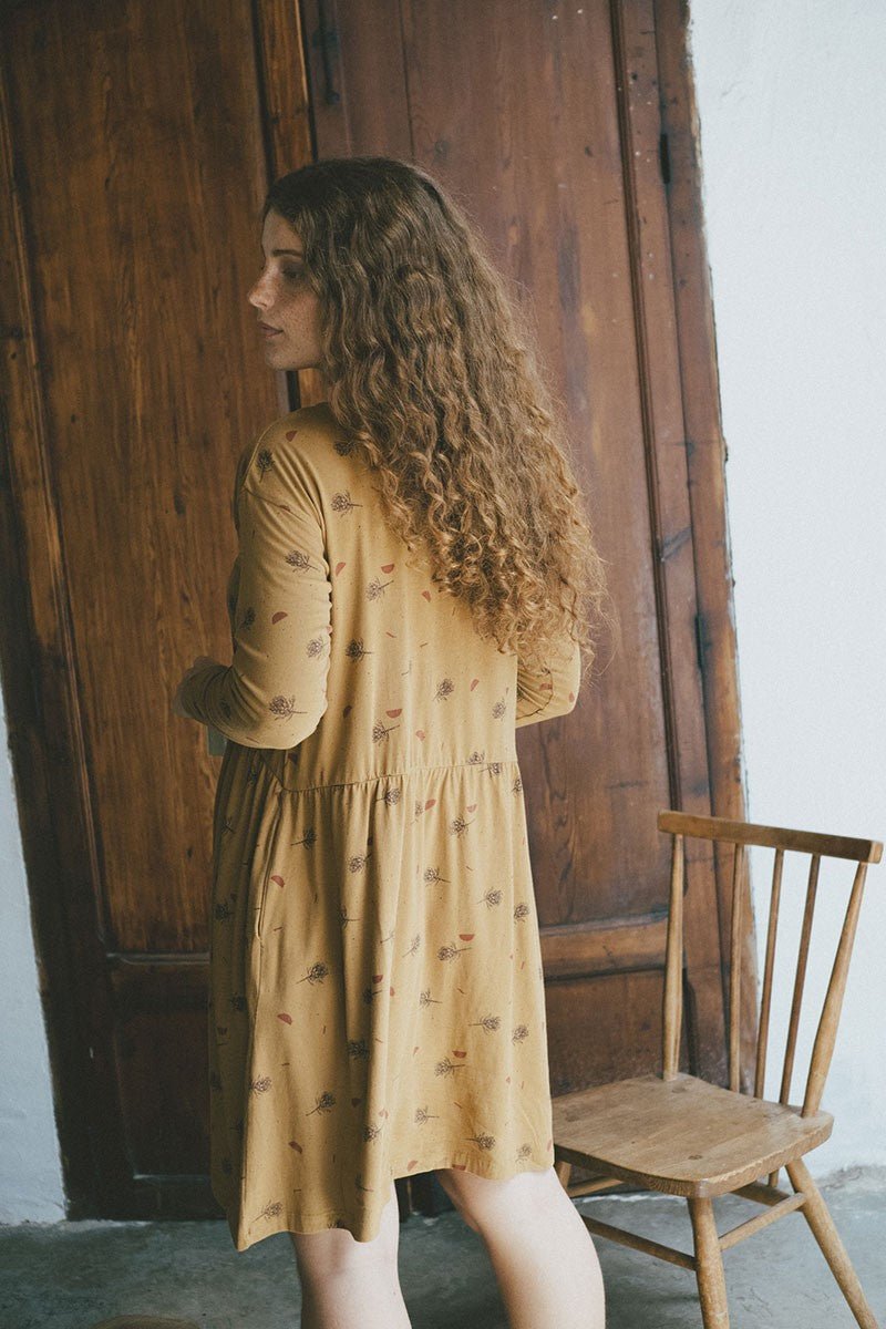 Selma is a loose-fitting dress with dropped shoulders, V-neckline and slit with covered buttons. Fitted at the waist and with pockets on the sides. It is a casual, very comfortable knitted garment that can be worn during pregnancy and while breastfeeding. In mustard with thistle flower print inspired by the most essential, our environment. Our home, HOME, gives that special touch to the garment.
