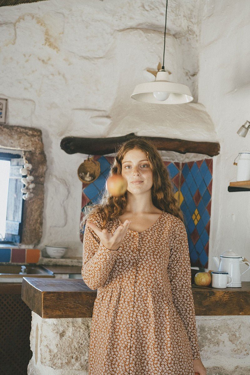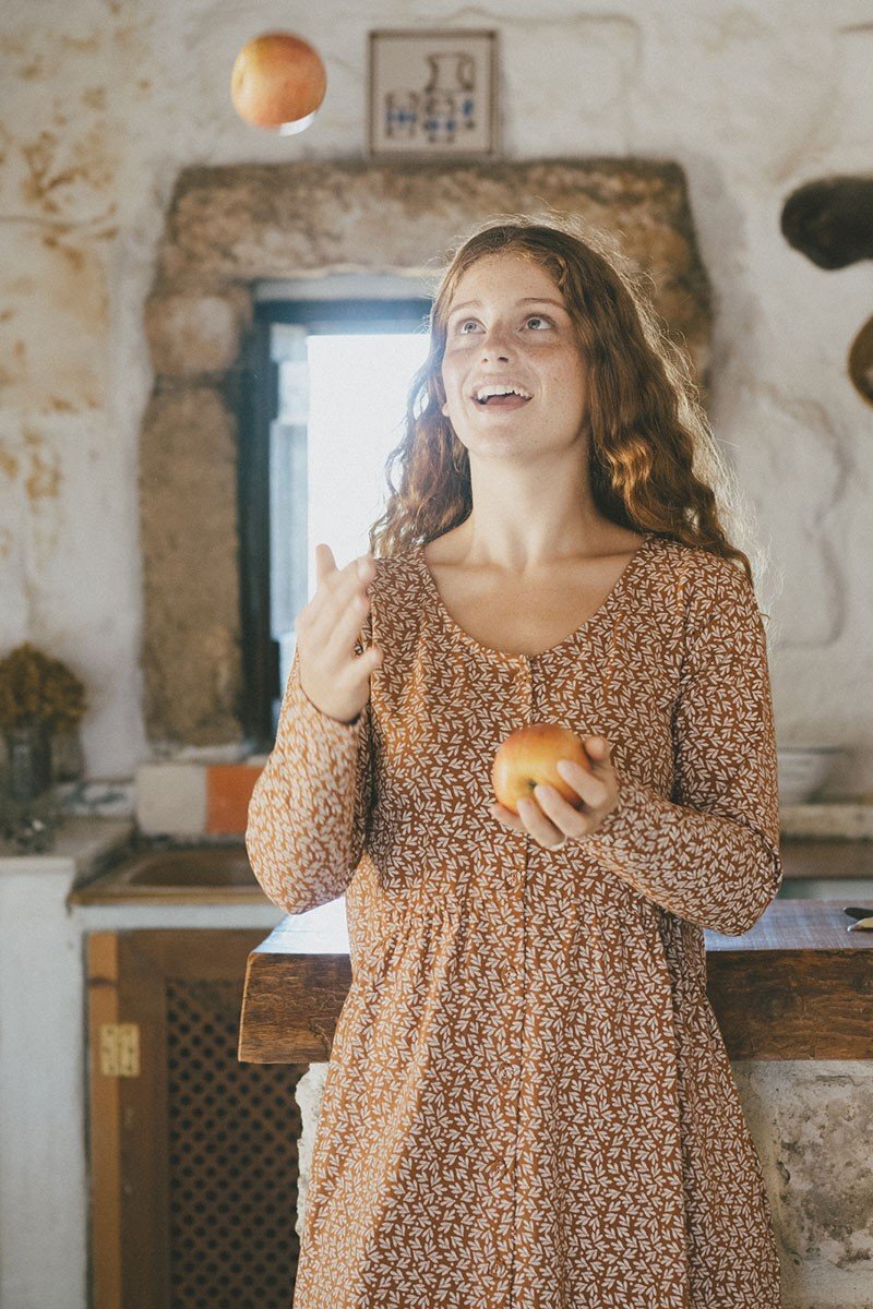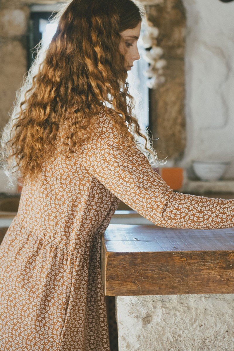 Selma is a loose-fitting dress with dropped shoulders, V-neckline and slit with covered buttons. Fitted at the waist and with pockets on the sides. It is a casual, very comfortable knitted garment that can be worn during pregnancy and while breastfeeding. In terracotta with olive leaves print inspired by the most essential, our environment. Our home, HOME, gives that special touch to the garment.