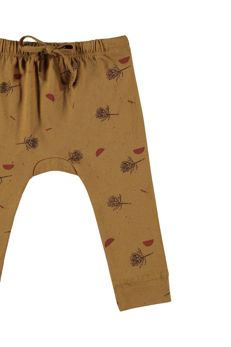 Baby pants. A garment to wear all year round. It fits perfectly to any baby’s body and has a ribbon at the waist for better fit and comfort. In mustard with thistle flowers print inspired by the most essential, our environment. HOME gives this garment an special touch. All our garments are hypoallergenic and chemical free to take care of your child’s sensitive and delicate skin.