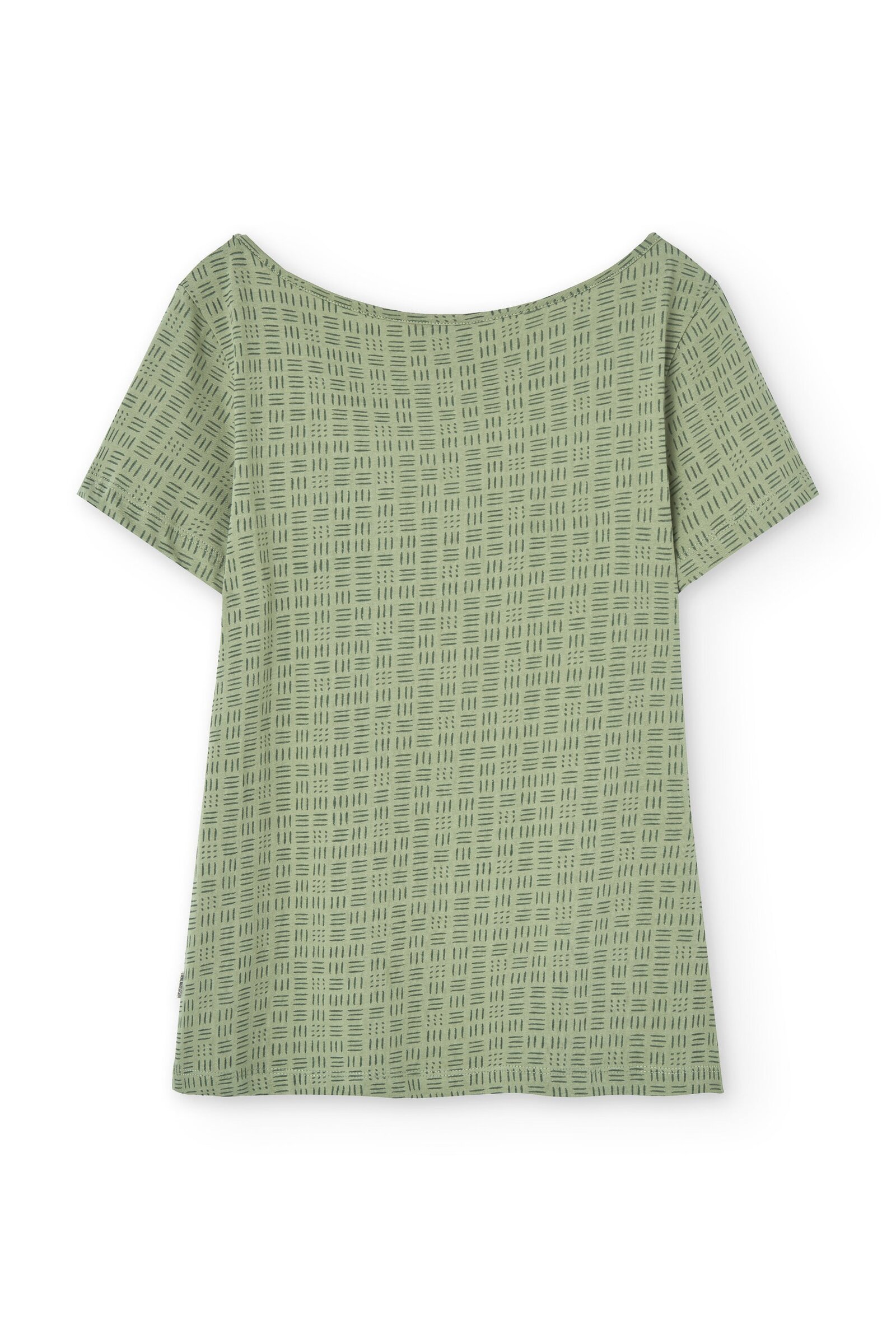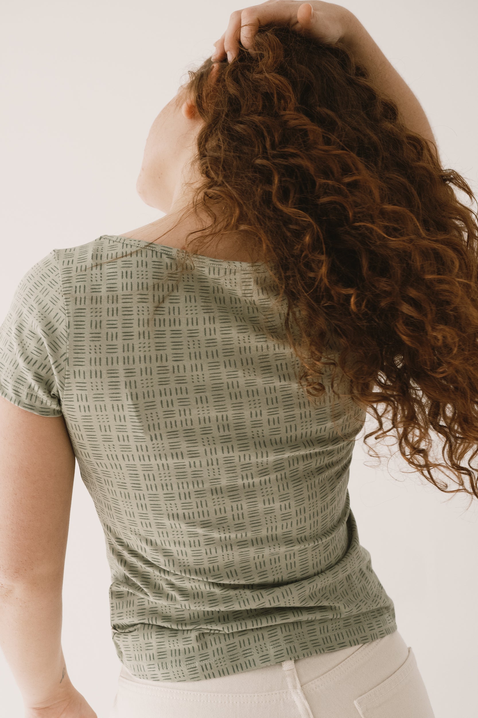 Hilda is a must-have, timeless basic for your sustainable wardrobe. It’s the new version of our classic T-shirt with short sleeves and a round neckline. Crafted from high-quality Organic cotton fabric and eco-friendly dyes. Mix and match it with our beige-colored Hani pants or the green Halia skirt for endless outfit possibilities. The wicker print from our DREAM collection draws inspiration from the intricate weaving and bonds we create with our artisan partners, who meticulously craft and cherish every detail of your garments. A tapestry of cultures!