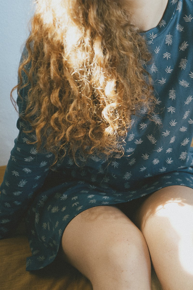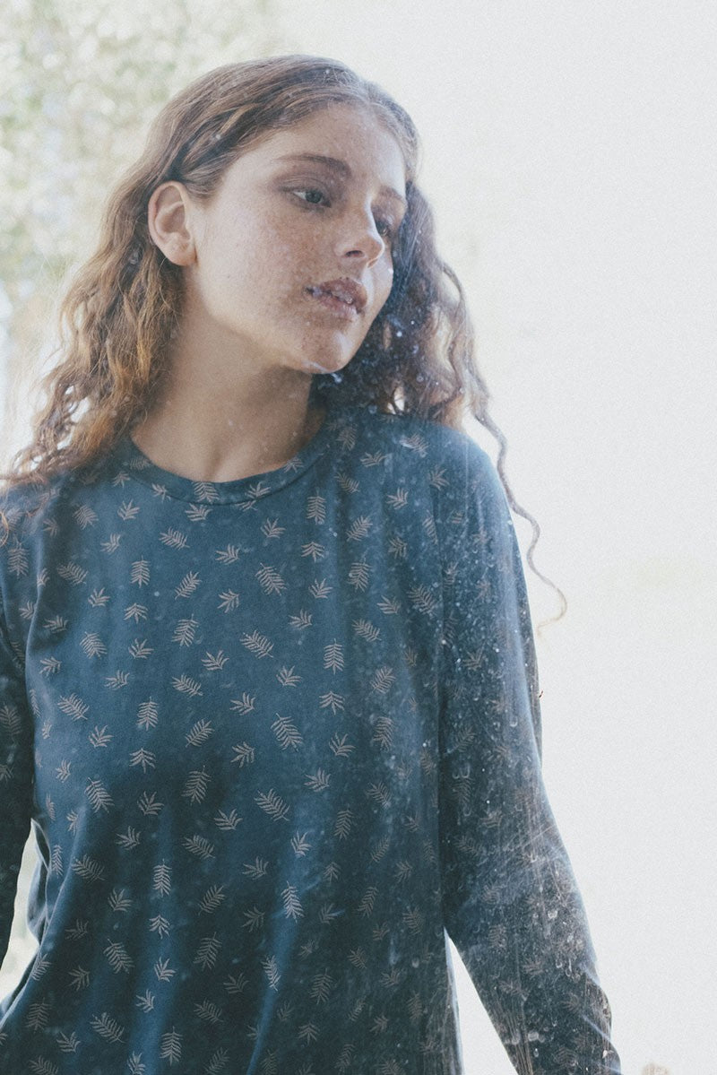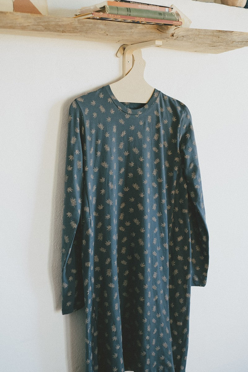 Sol is a knitted dress with long sleeves and evasé cut. This design is perfect for any body shape, you can even wear it if you are pregnant. In blue with fern leaf print inspired by the most essential, our environment. Our home, HOME, gives that special touch to the garment.