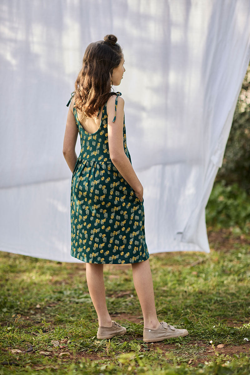 Strappy dress with adjustable ties and gathered waist. It has pockets on the sides so your little one can keep his/her treasures. This dress has a loose-fitting silhouette and is very comfortable and cool for hot summer days. It also looks great with a T-shirt underneath as a pinafore for the in-between months. Its blue-green-coloured ethnic print from the Kudumbam collection, which means family in Tamil, inspired by the core philosophy of Tiralahilacha, gives it that unique and special touch. It feels very soft and pleasant on the skin. In addition, it is made free of toxins and is hypoallergenic for your little one delicate skin.