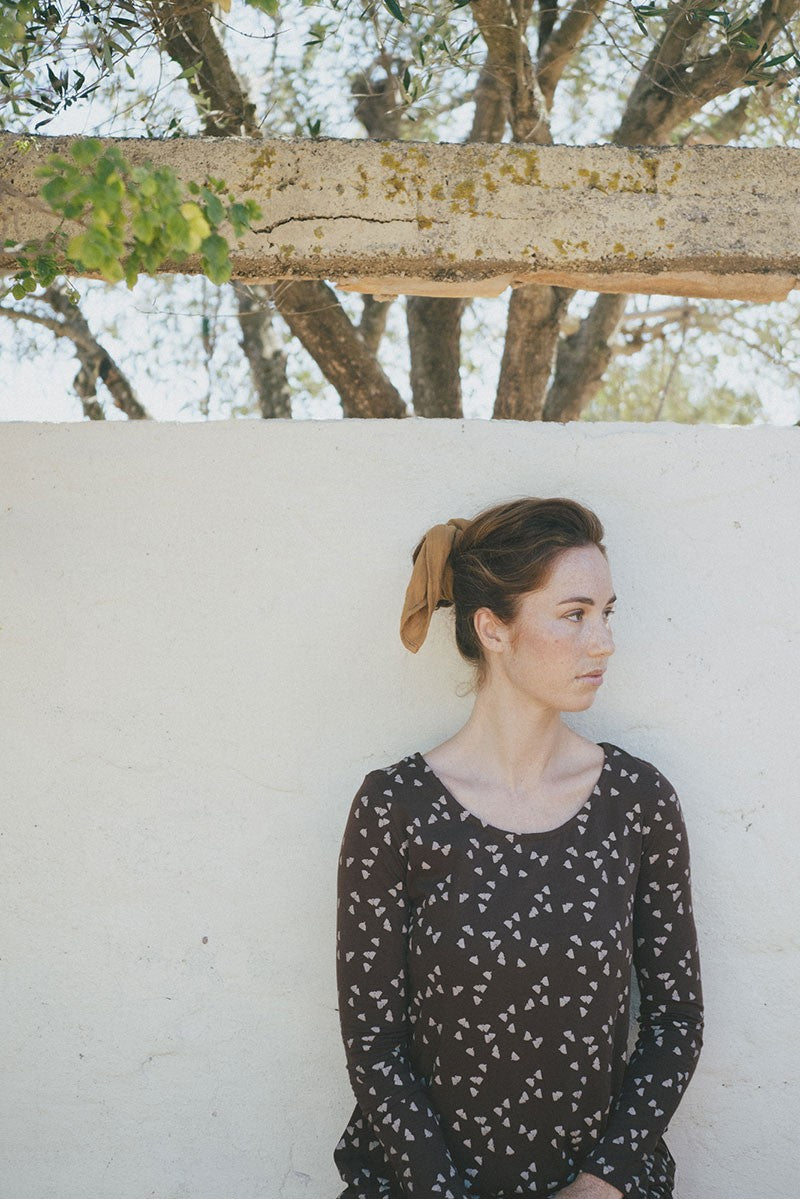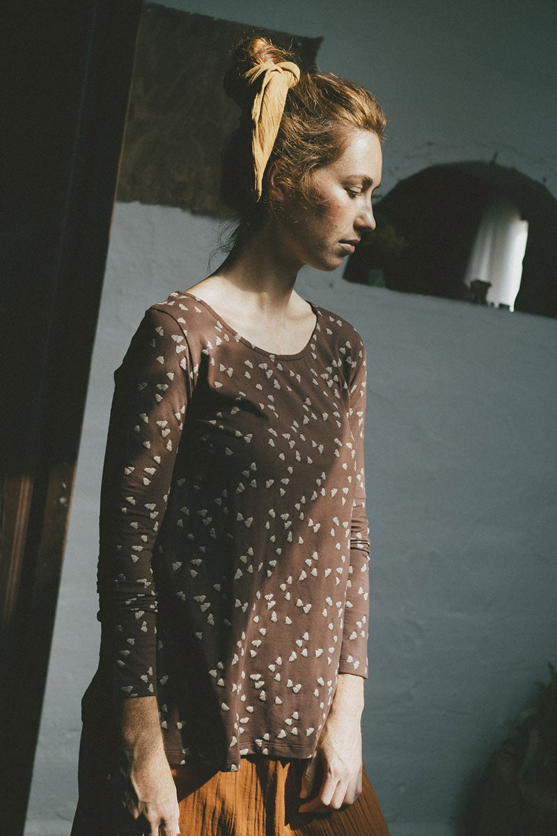 Suny is a knitted blouse with round neckline and evasé cut. The brown acorn print is inspired by the essential, our environment. Our home, HOME, gives that special touch to the garment. You can combine it with the Sibila trousers to wear your complete outfit.