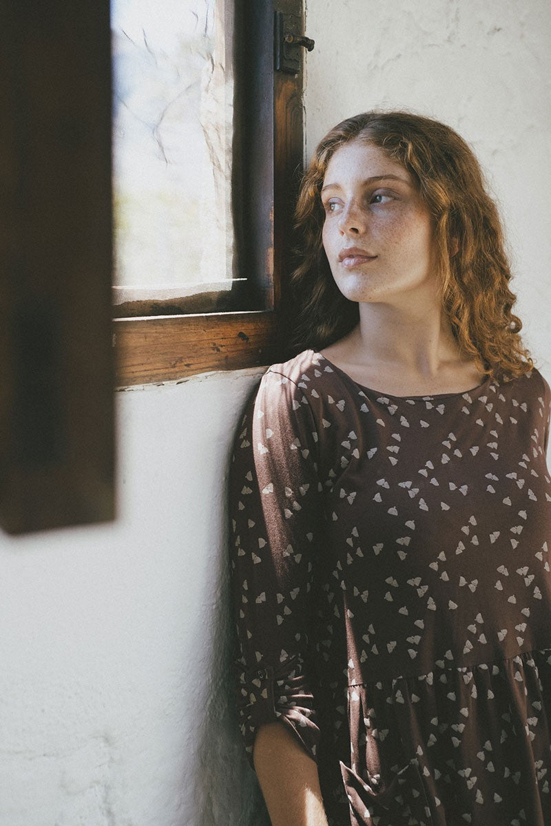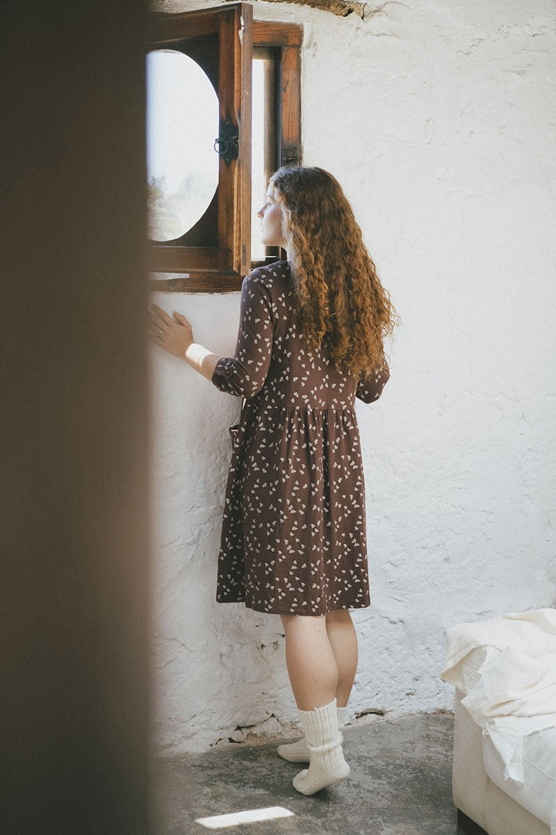 Susette is a loose-fitting knit dress with a round neckline and cut at the waist. es un vestido holgado de punto con escote redondo y corte en la cintura. The sleeves have a strap that can be attached to a button, enabling the sleeves to be rolled up. It is a cosy and casual garment that you can wear even during the months of pregnancy. Its acorn print in brown is inspired by the most essential, our environment. Our home, HOME, gives that special touch to the garment.