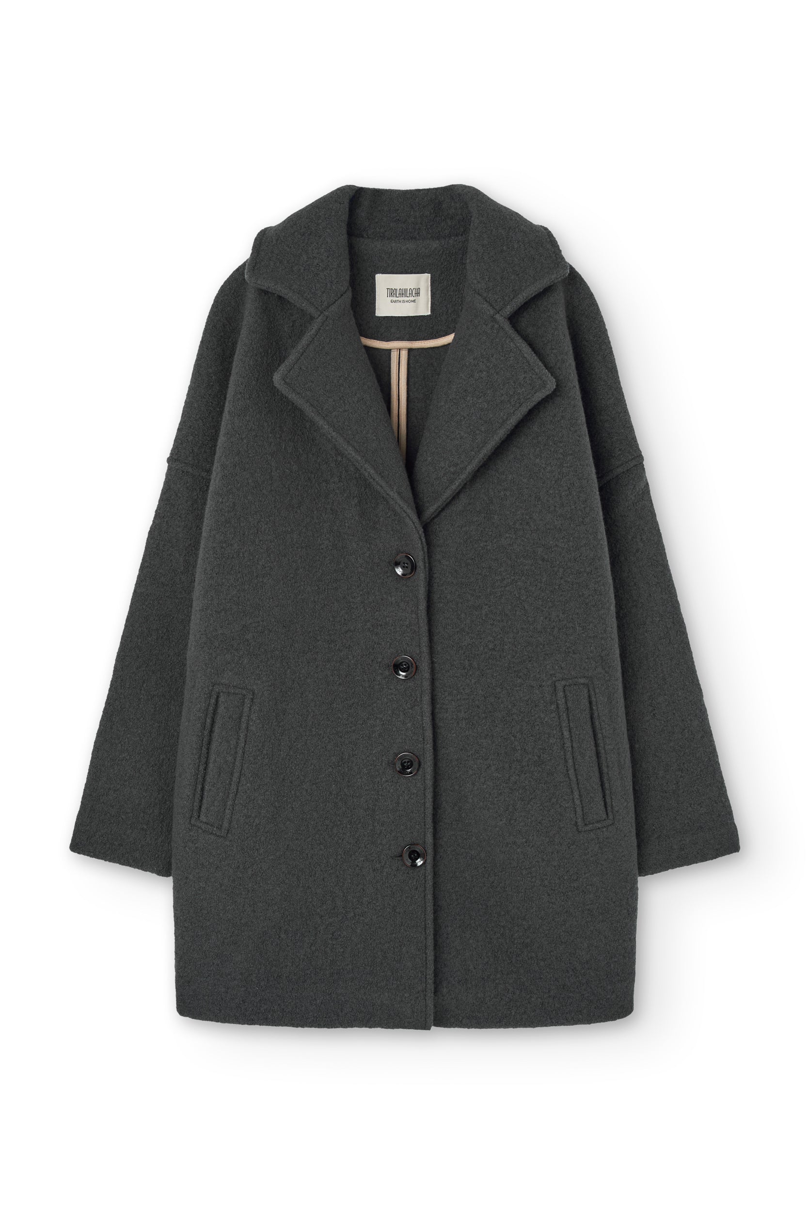 We are absolutely in love with this coat! Designed to be a timeless winter classic, it features a mid-lenght cut with relaxed sleeves and natural corozo buttons. The interior seams are finished with a contrasting cotton bias. Crafted from high-quality responsibly sourced Merino wool (RWS y Woolmark certified). Made with care in our family-run factory in Tàrrega. The bark grey color is an essential, versatile shade that brings a touch of seriousness and stability. It’s a durable, timeless and makes us feel elegantly minimalist.