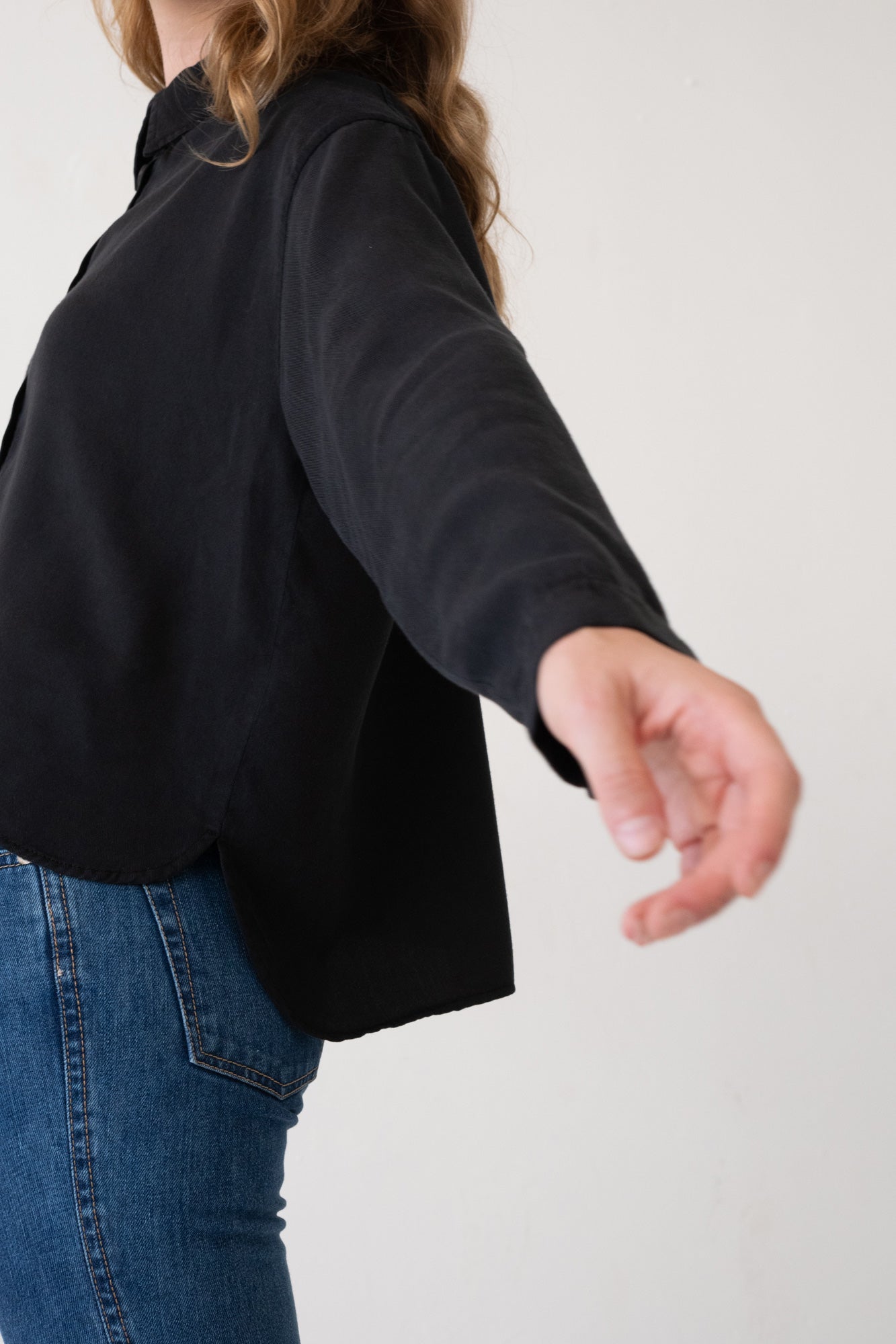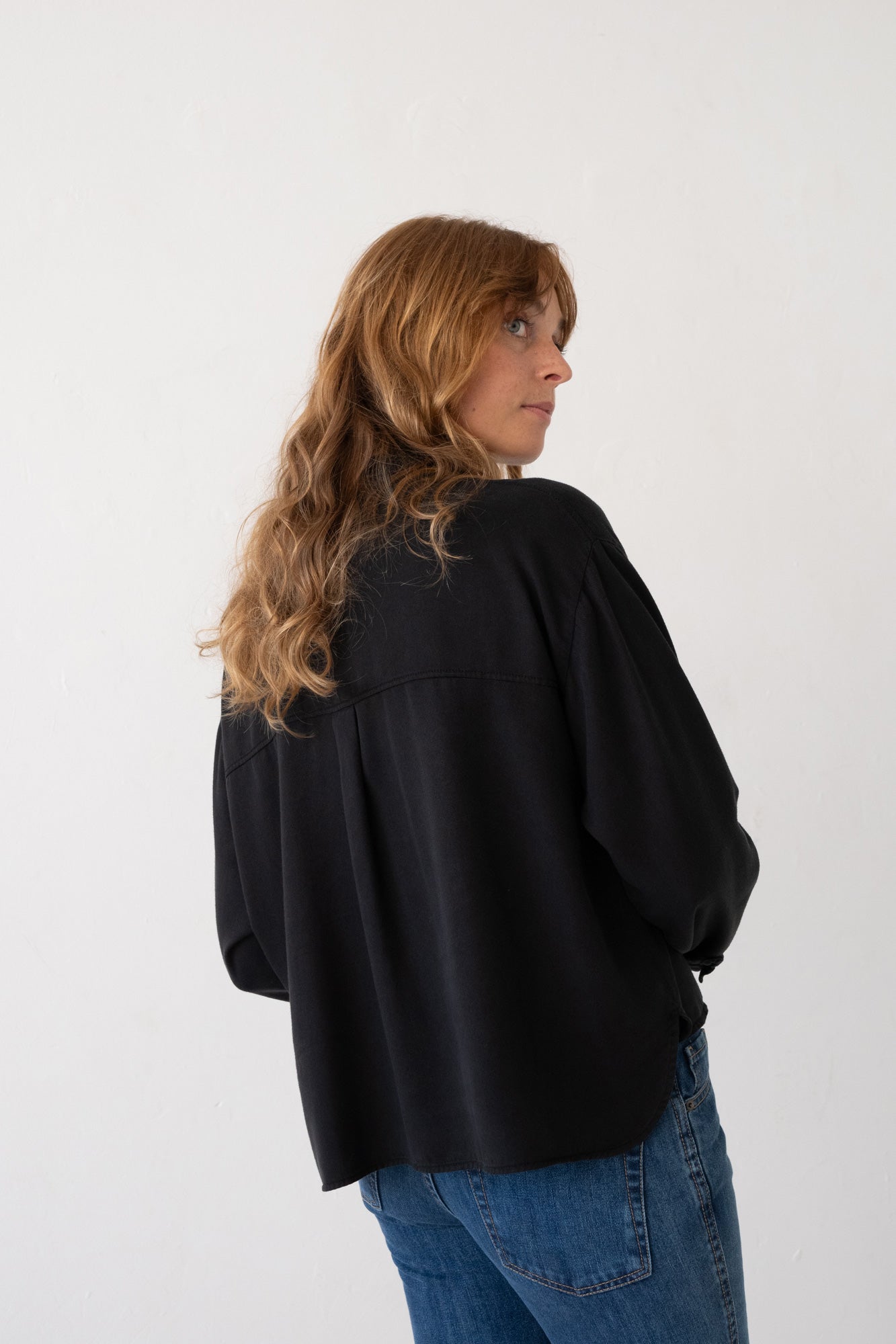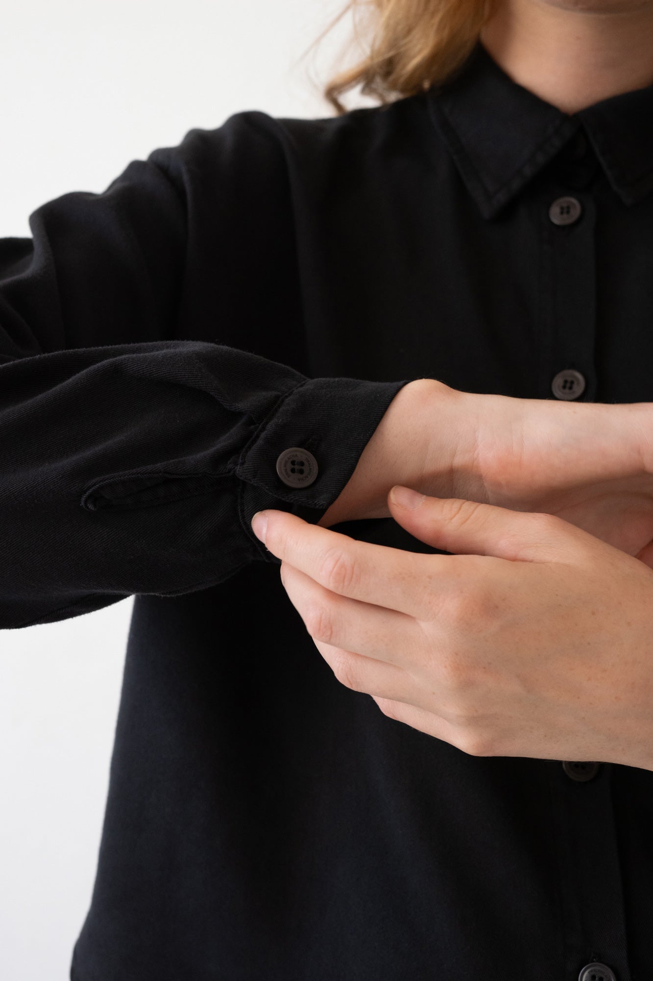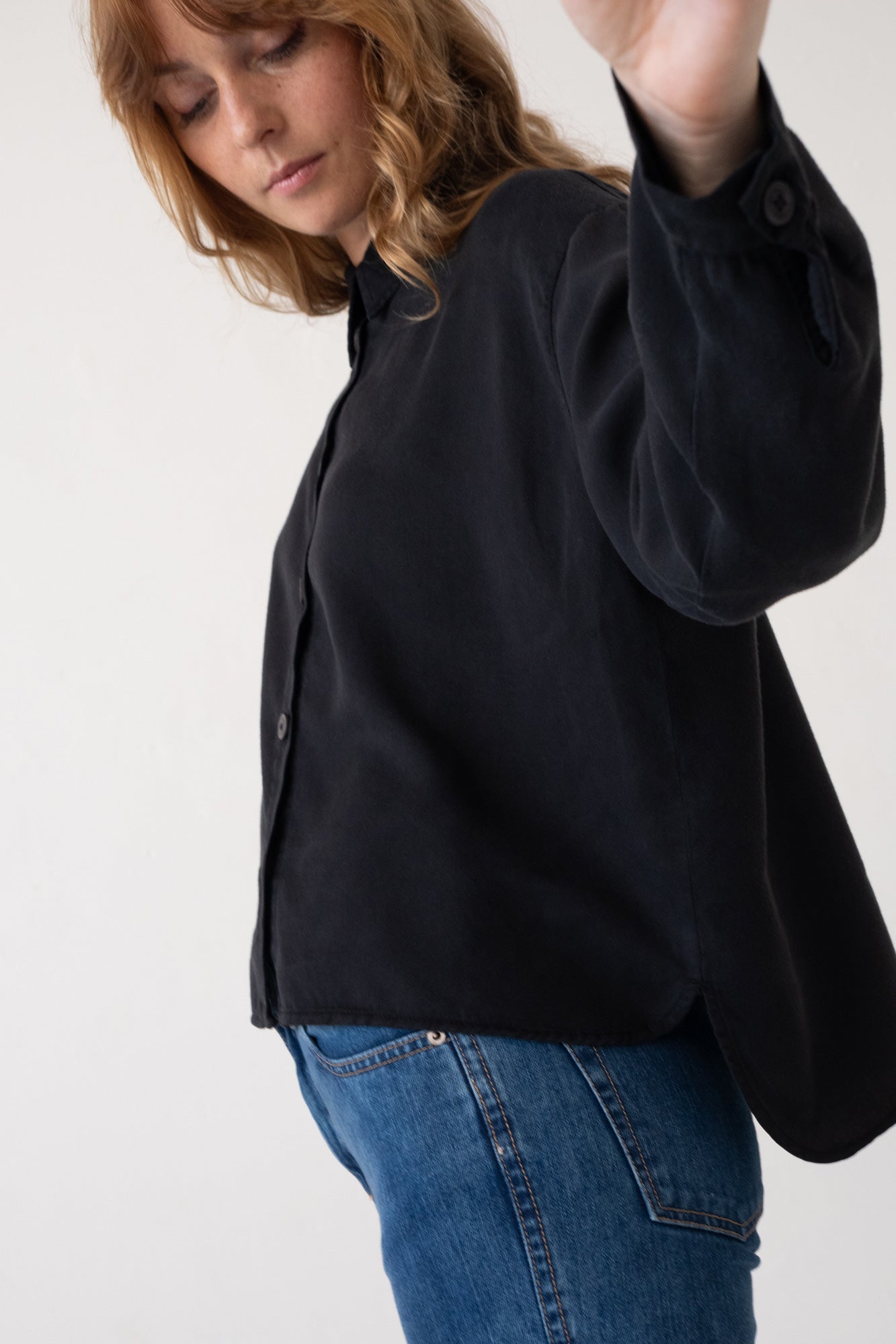 Tait is a sophisticated and incredibly versatile shirt. With an oversized cut, shirt collar, and tone-matched corozo buttons, it’s light, soft, and wonderfully touchable. Made from 100% Lenzing TENCEL™  rayon in our Tàrrega family-run factory, this shirt can be dressed down with our Denim for a casual look or paired with tailored trousers for a more polished style. It’s berry black is the ultimate neutral color, alongside white, offering serenity and confidence.