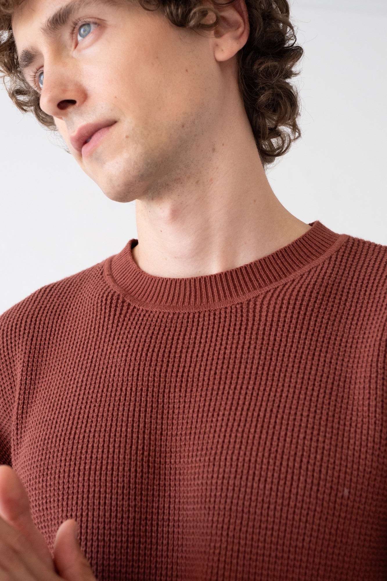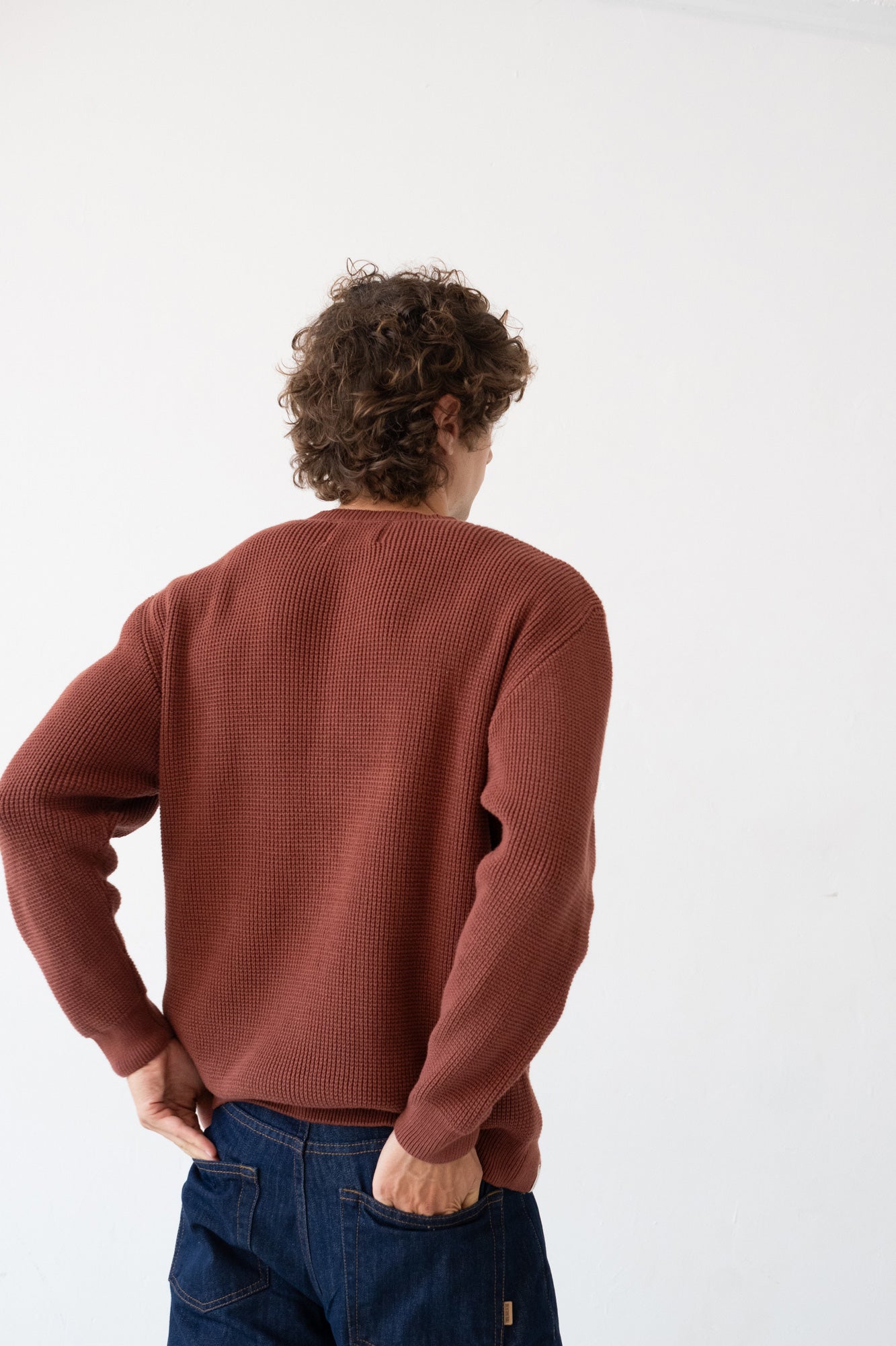 Tam is the a men’s sweater with a perfect fit and length. A quality basic that will last over time and can be paired with countless garments. Crafted from the finest organic cotton sourced from Italy, in a family-run factory in Spain. Very soft and pleasant to the touch, the ideal garment to keep you cosy and warm all year round! Garnet Grosella is a sexy color that stirs up passion and sensuality. It’s an energizing, antioxidant shade that boosts our vitality and strength. It is one of the most flattering shades, as it enhances any skin tone.