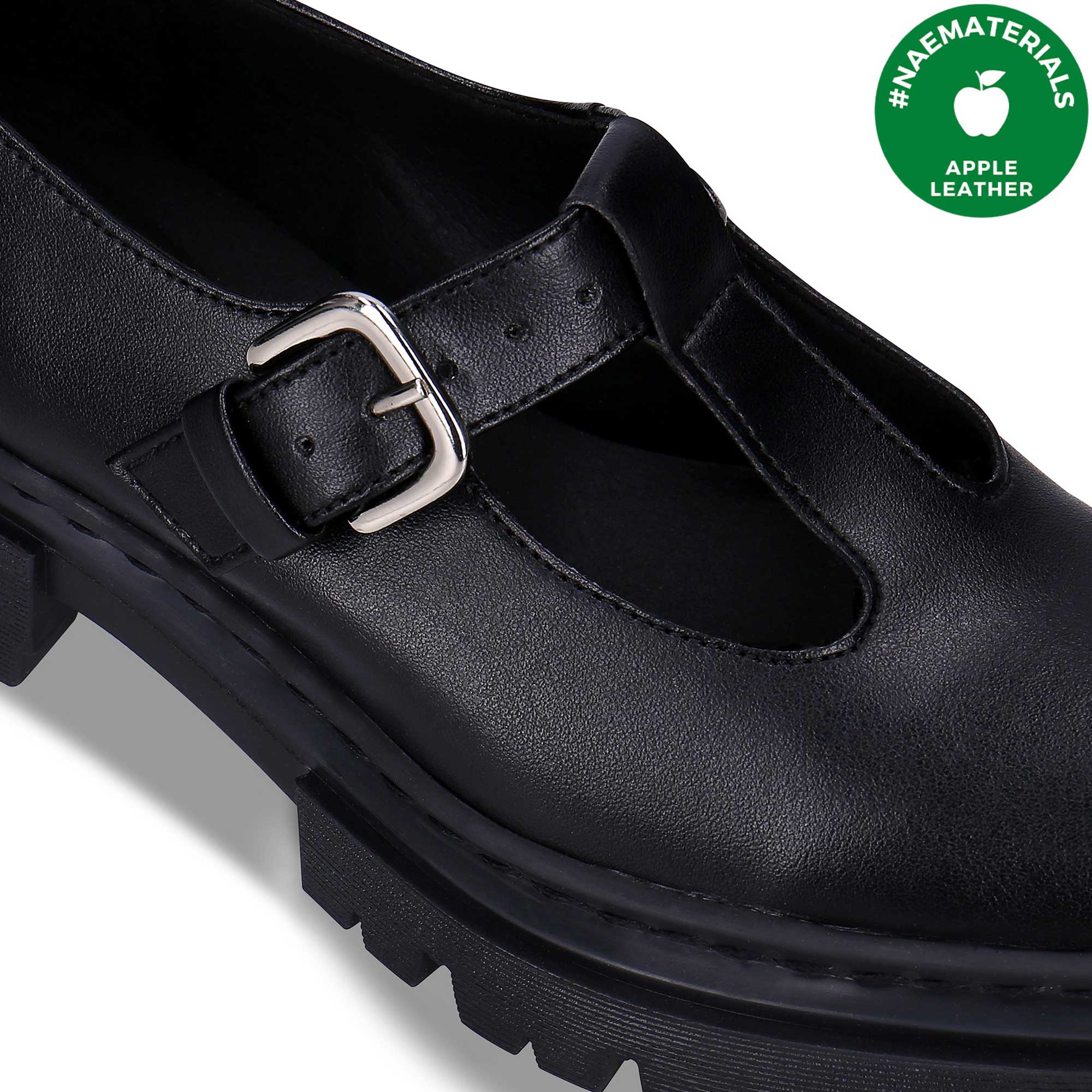 Meet Teresa Black, the Mary Jane shoes crafted from Apple Leather—derived from the recycling of residues in apple juice production—an innovative and cruelty-free alternative to traditional leather. These vegan shoes boast a solid pattern with distinctive elements, including a non-slip, eye-catching sole and an adjustable buckle strap for a tailored fit. Designed with hypoallergenic, toxin-free materials, these shoes prioritize breathability, antibacterial properties, and moisture-wicking comfort. Their padded footbed offers arch support, ensuring flexibility and blister-free wear.