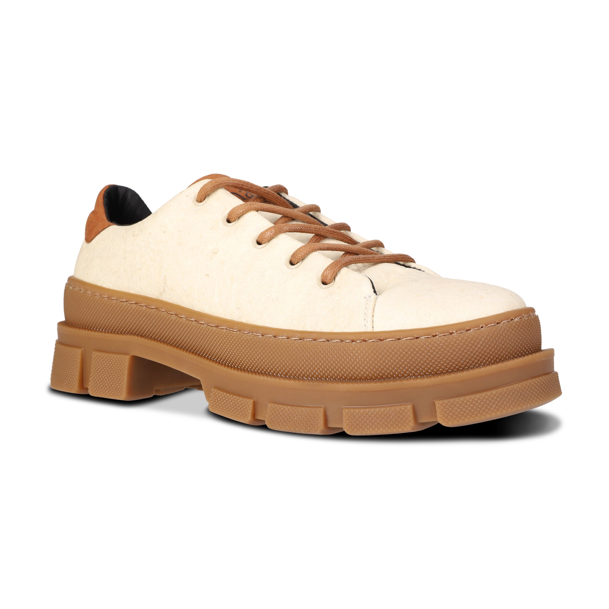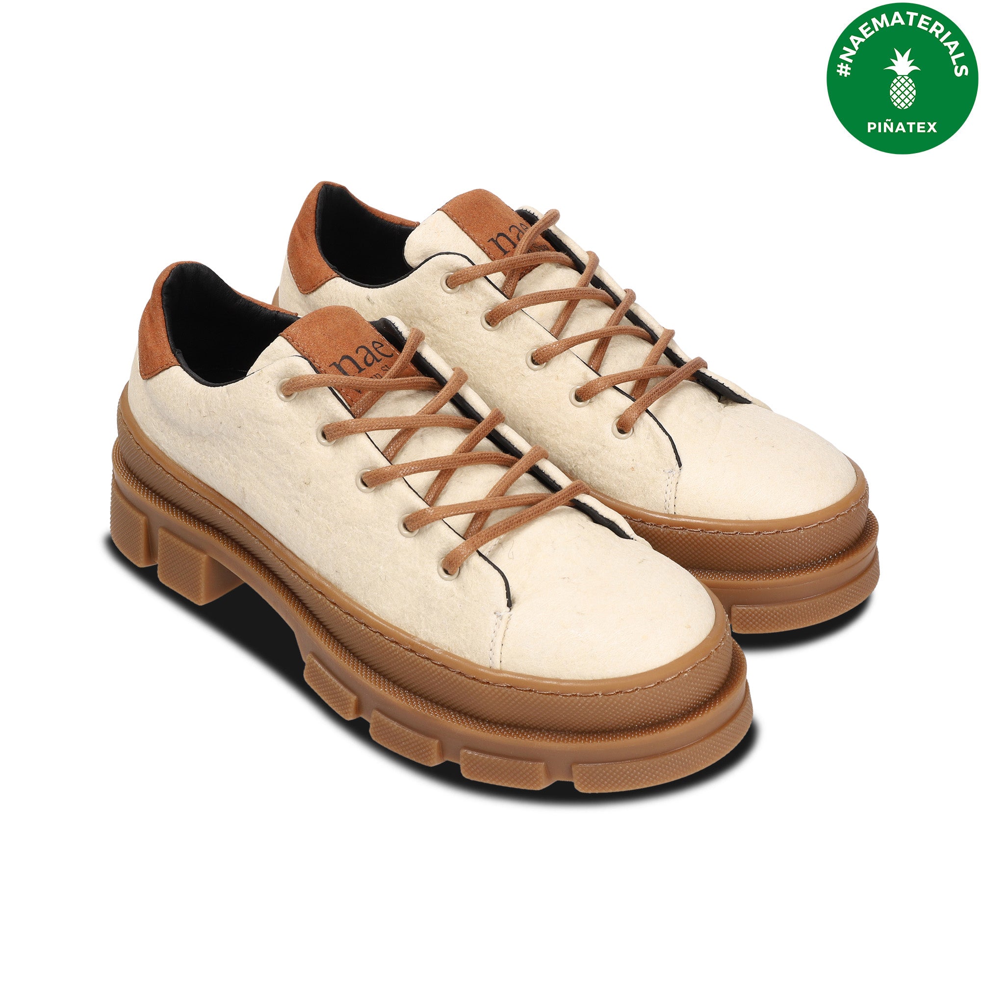 Discover Thyme White, the low-top vegan sneakers with a chunky sole crafted from Piñatex, an innovative material derived from pineapple leaf fibers, promoting sustainability and cruelty-free footwear. These contemporary shoes boast a sporty sneaker style with robust soles and an uppercut for originality. Complemented by a cushioned ankle cut in a matching brown hue and a tongue label, adding to their allure. Hypoallergenic and toxin-free, they prioritize breathability and antimicrobial properties, preventing sweat and odors. With a moisture-wicking padded footbed, these comfortable shoes ensure a blister-free experience, perfect for indoor and outdoor wear, effortlessly complementing various looks.