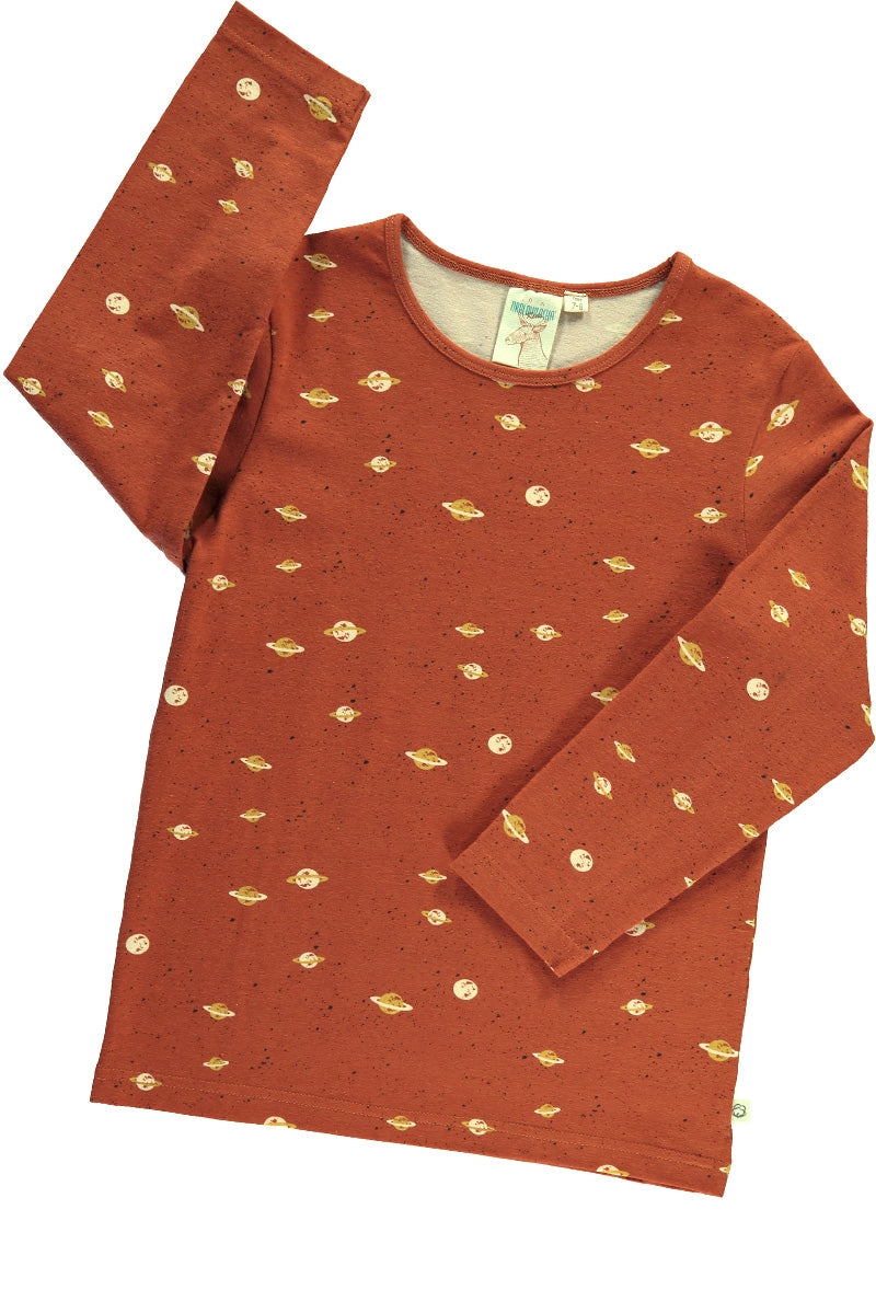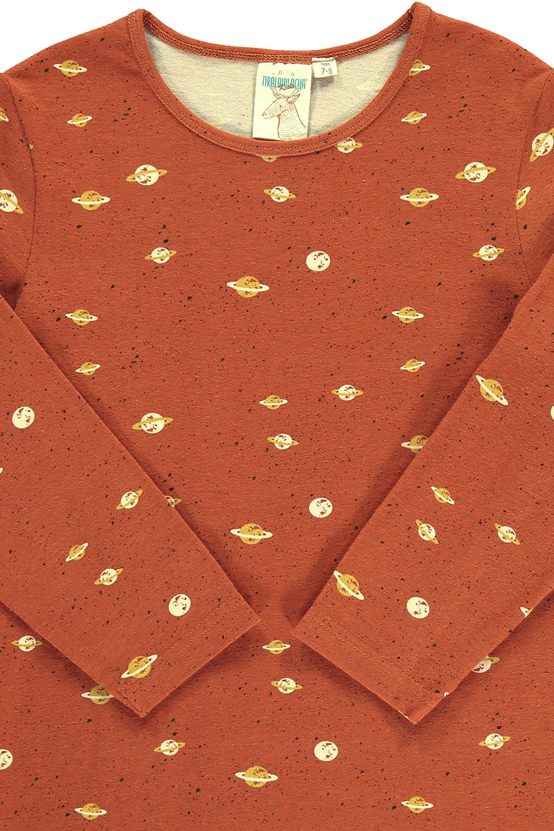 All our long sleeve t-shirts are unisex. The warm terractota color with Saturn print, makes this garment a very special and original one. All our dyes and prints are enviromentally friendly. 95% Fair Trade Organic Cotton, 5% Elastane. Designed with ♥ in Barcelona. Ethically made in India.
