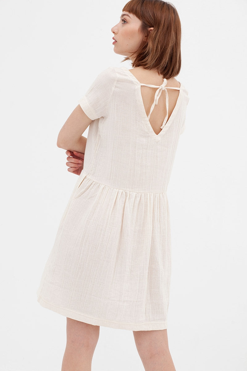 El vestido Anne color crudo es una prenda romántica y delicada con un corte holgado y cómodo. Lleva botones de coco funcionales con una pasamanería y bolsillos laterales. Está hecho con tejido de muselina. Este color lleva forro de algodón.