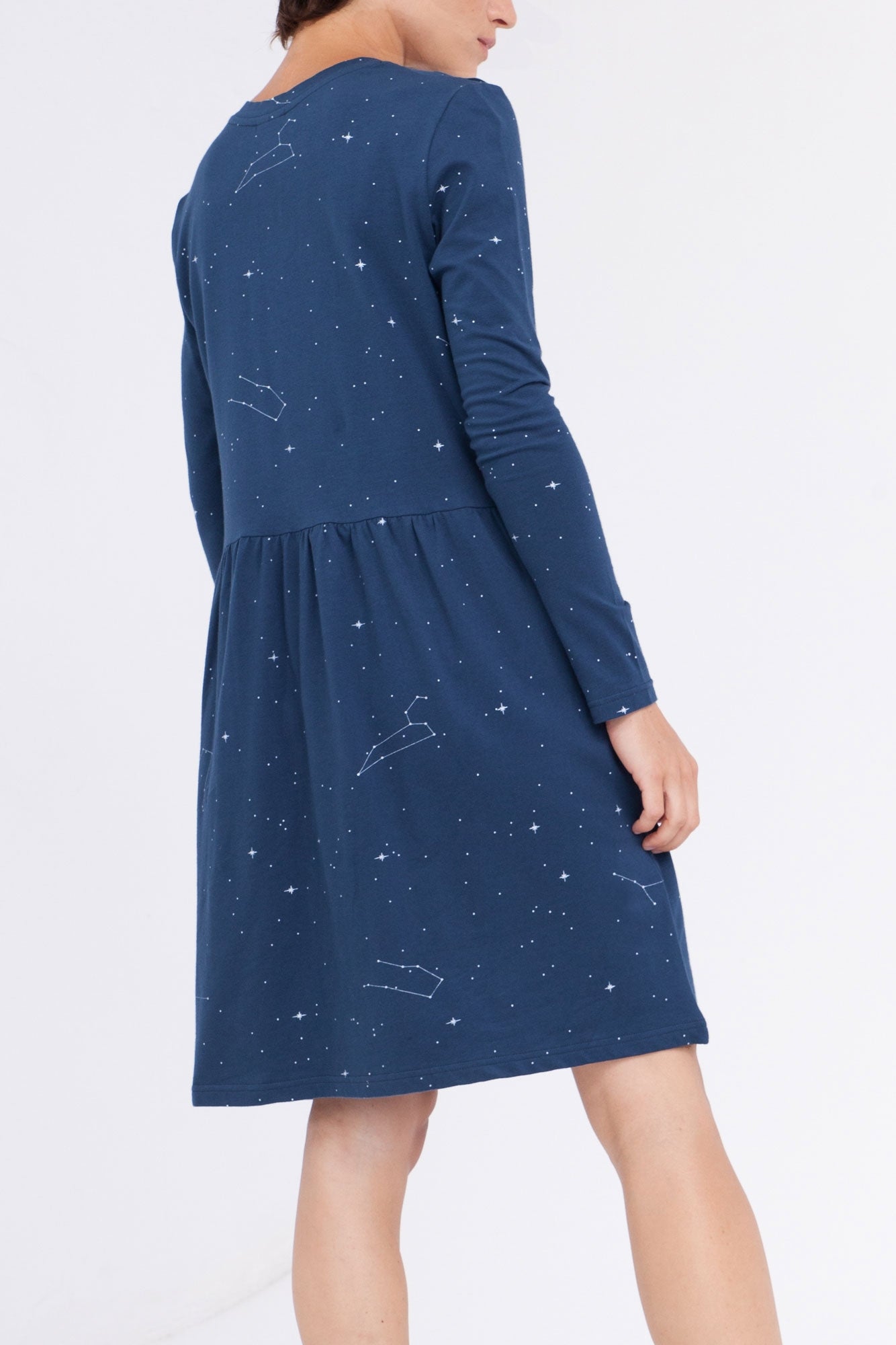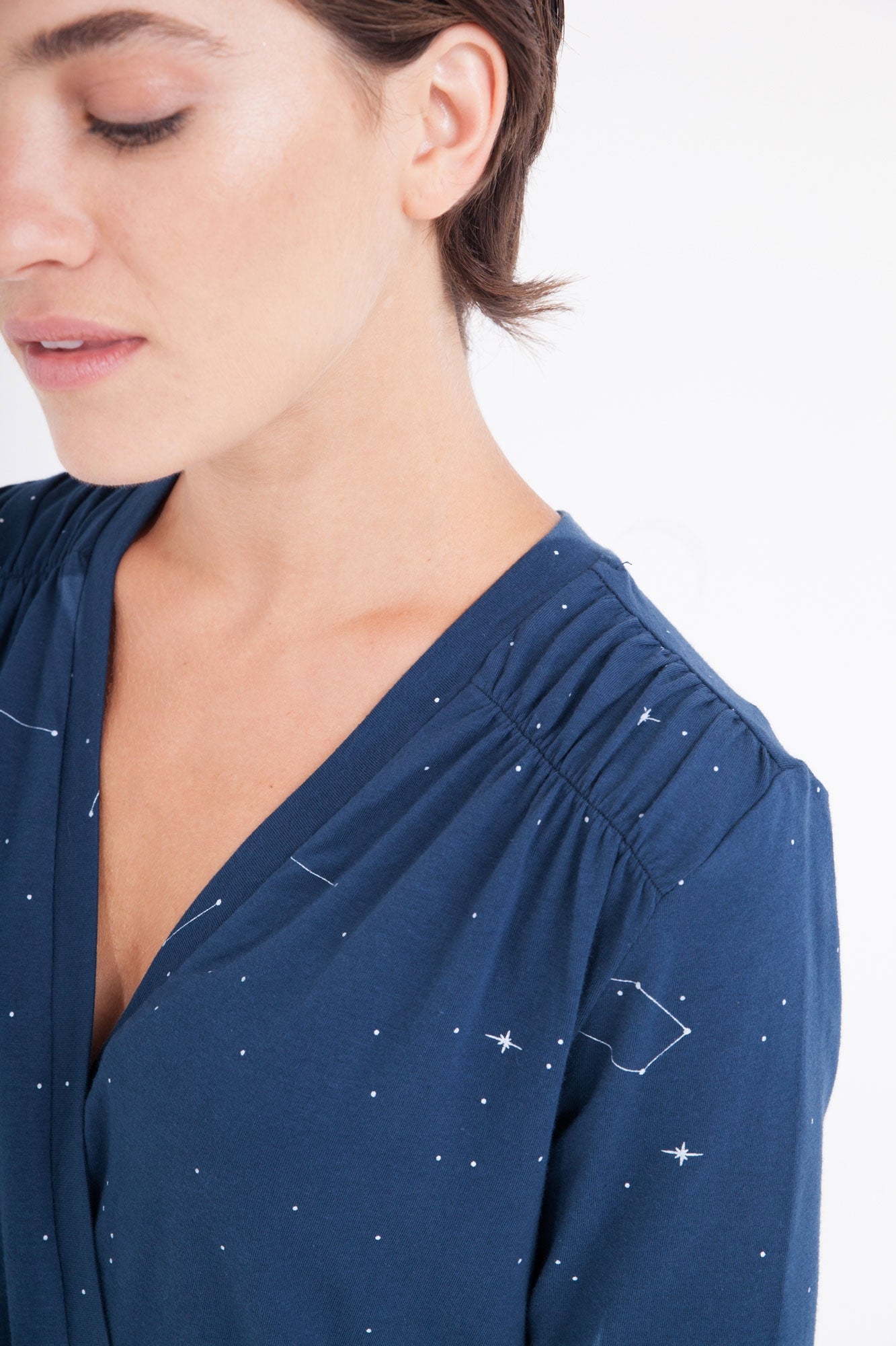 Camile es un vestido con escote cruzado oversize que se adapta muy bien a todo tipo de cuerpos, al ser holgado es muy cómodo de llevar. Lleva bolsillos laterales y el escote cruzado que también puede ser teta-friendly. El estampado de Saturno le da ese toque especial, único y exclusivo a la prenda. Ropa de mujer ecológica confeccionada en algodón orgánico GOTS de comercio justo.