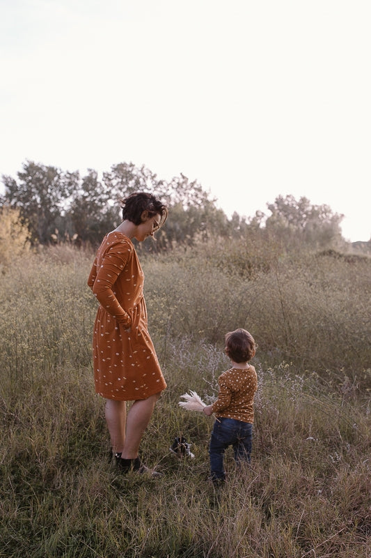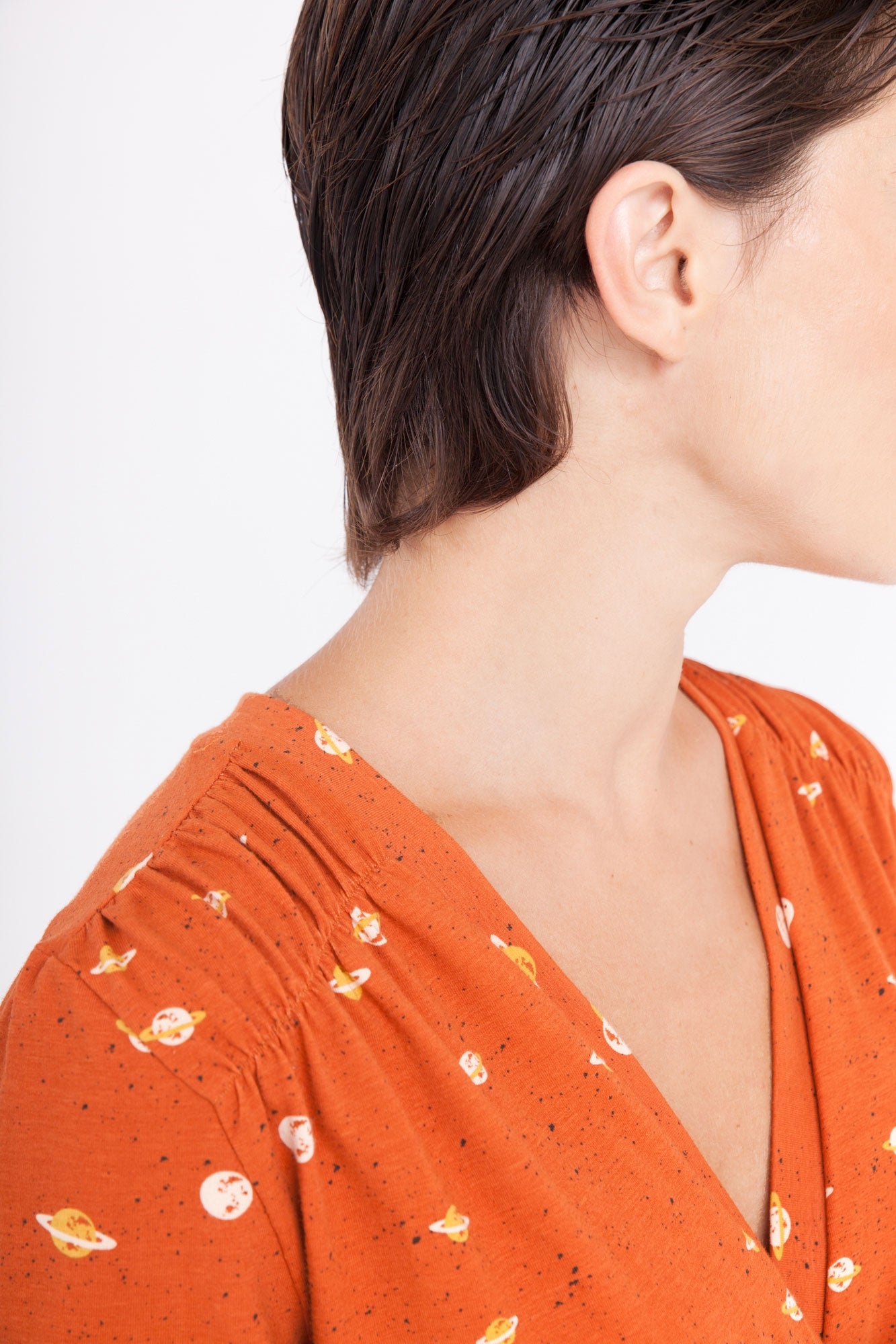 Camile es un vestido con escote cruzado oversize que se adapta muy bien a todo tipo de cuerpos, al ser holgado es muy cómodo de llevar. Lleva bolsillos laterales y al llevar el escote cruzado también puede ser teta-friendly. El estampado de constelaciones le da ese toque especial, único y exclusivo a la prenda. Ropa de mujer ecológica confeccionada en algodón orgánico GOTS de comercio justo.