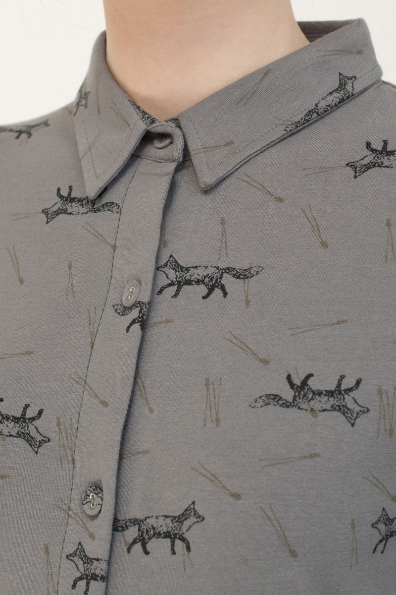 Vestido camisero con corte charlestón y botones forrados en gris con estampado zorros. Ropa de mujer ecológica confeccionada en algodón orgánico GOTS de comercio justo.