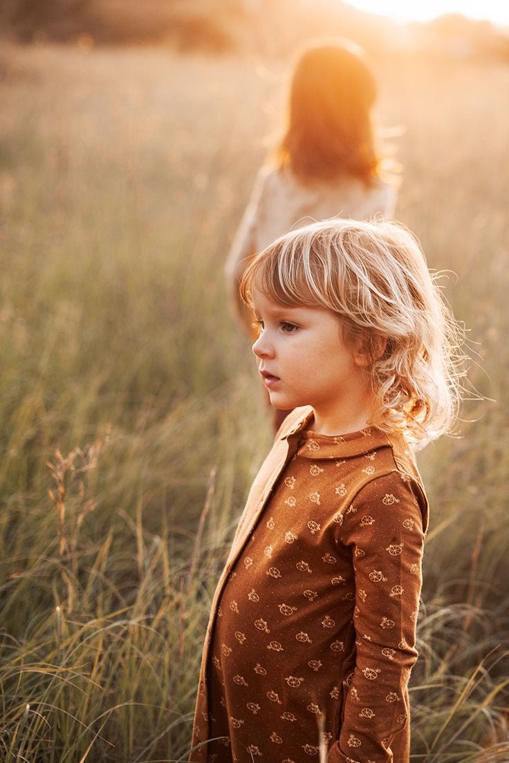 El vestido camisero manga larga es evasé y lleva bolsillos laterales. Es una prenda holgada y cómoda para dar libre movimiento. Además, el precioso color marrón y estampado de bicicletas inspirado en Circus, hace que sea una prenda especial, única y muy original.
