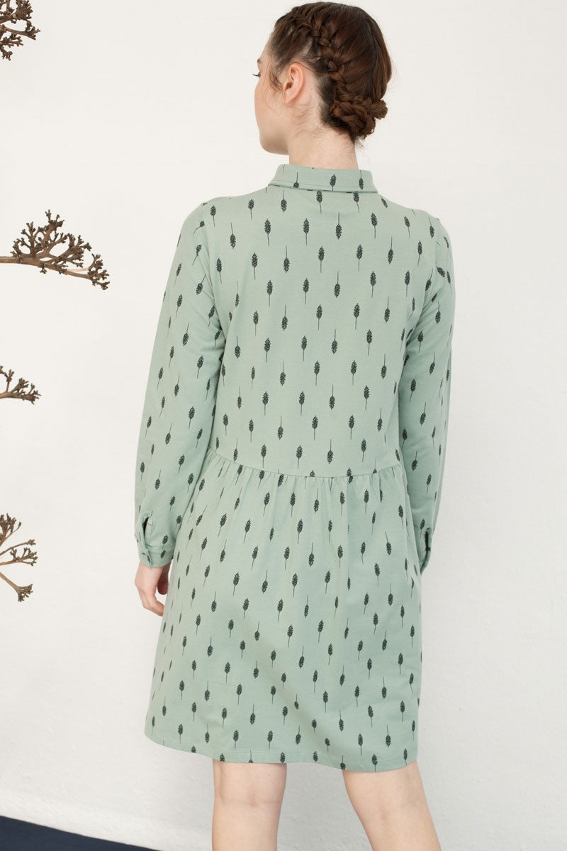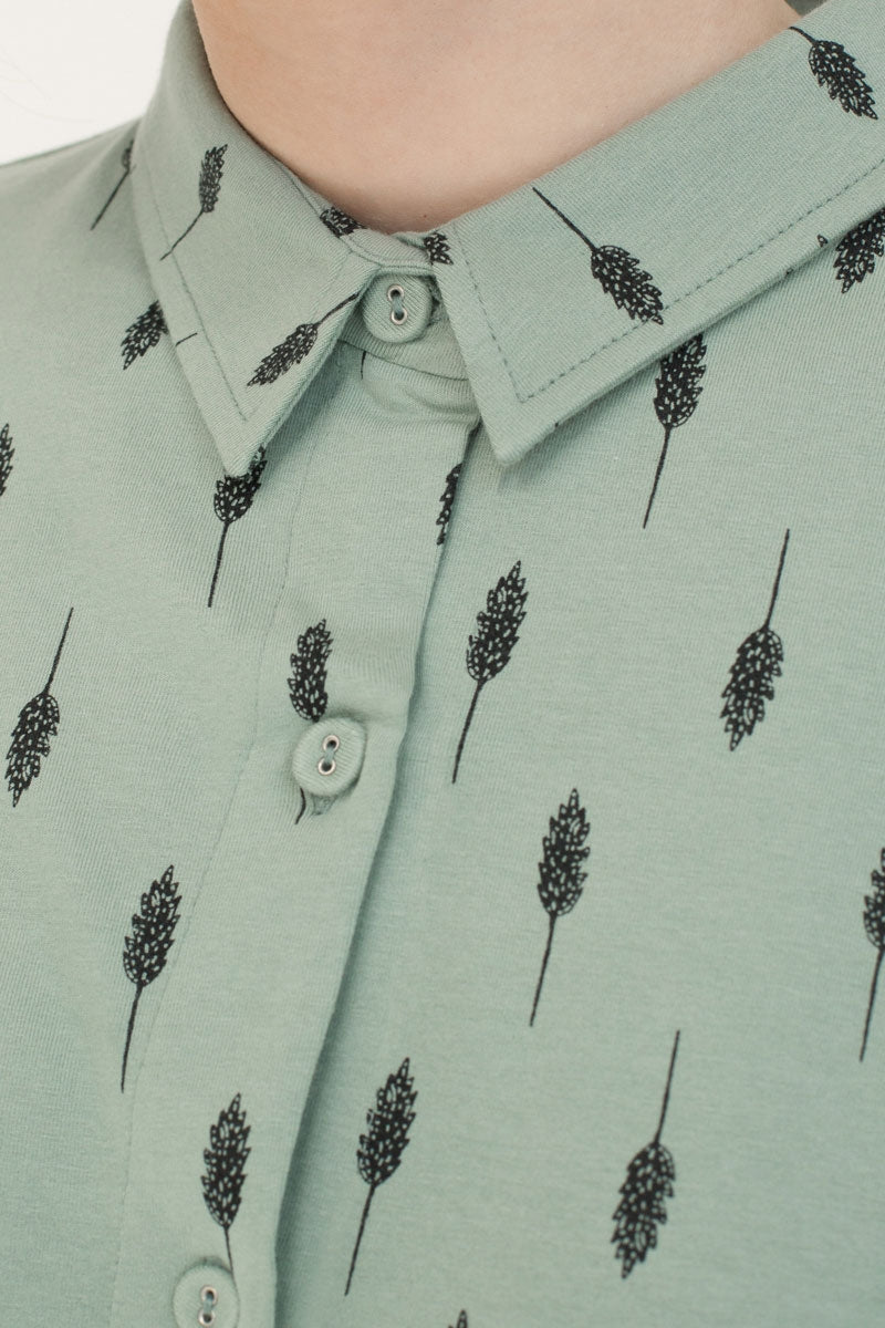 Vestido camisero verde agua con estampado hojas. Es un vestido over size muy cómodo. Ropa de mujer ecológica confeccionada en algodón orgánico GOTS de comercio justo.