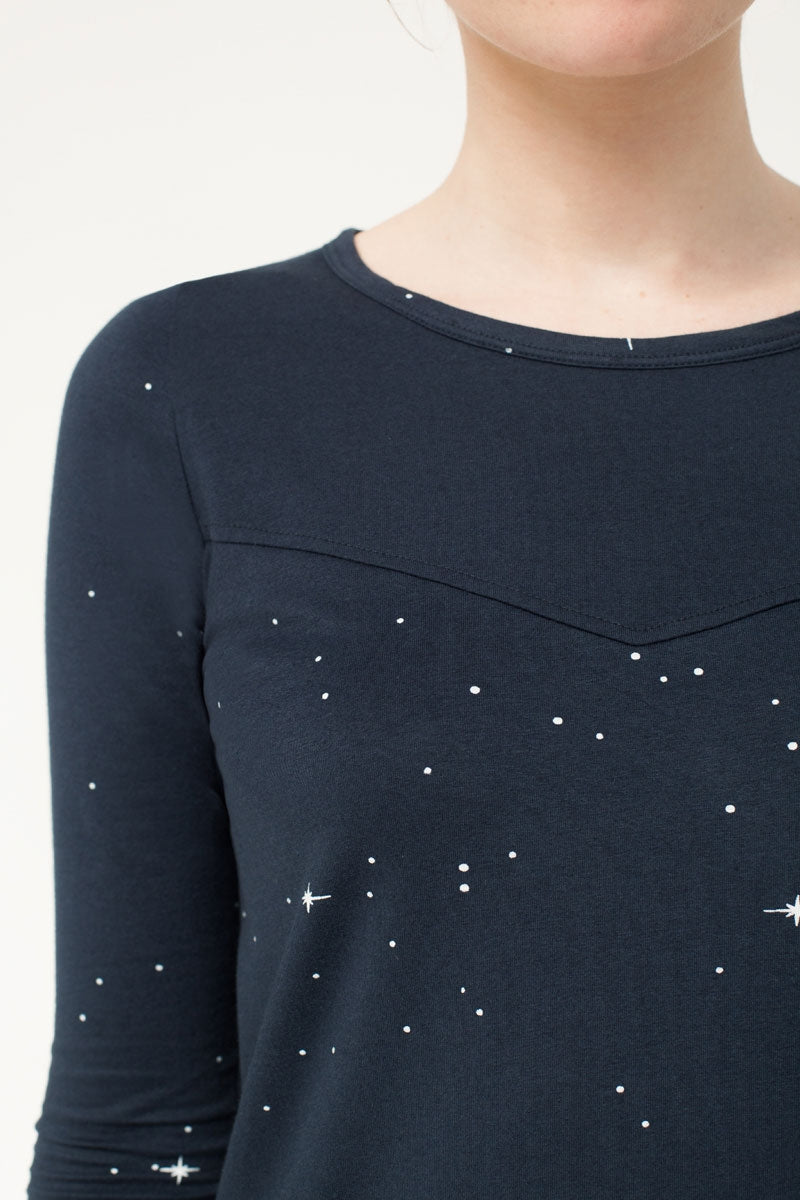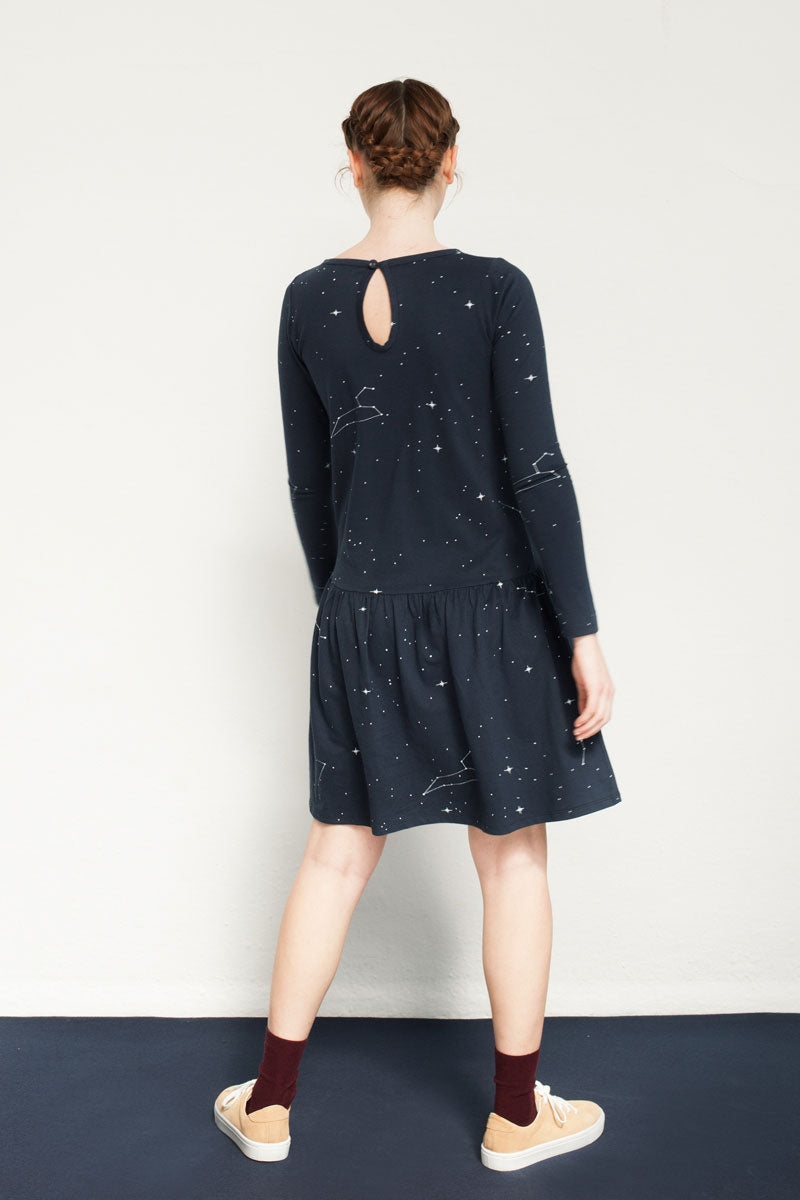 Vestido canesú con corte charlestón azul marino con estampado constelaciones. Ropa de mujer ecológica confeccionada en algodón orgánico GOTS de comercio justo.