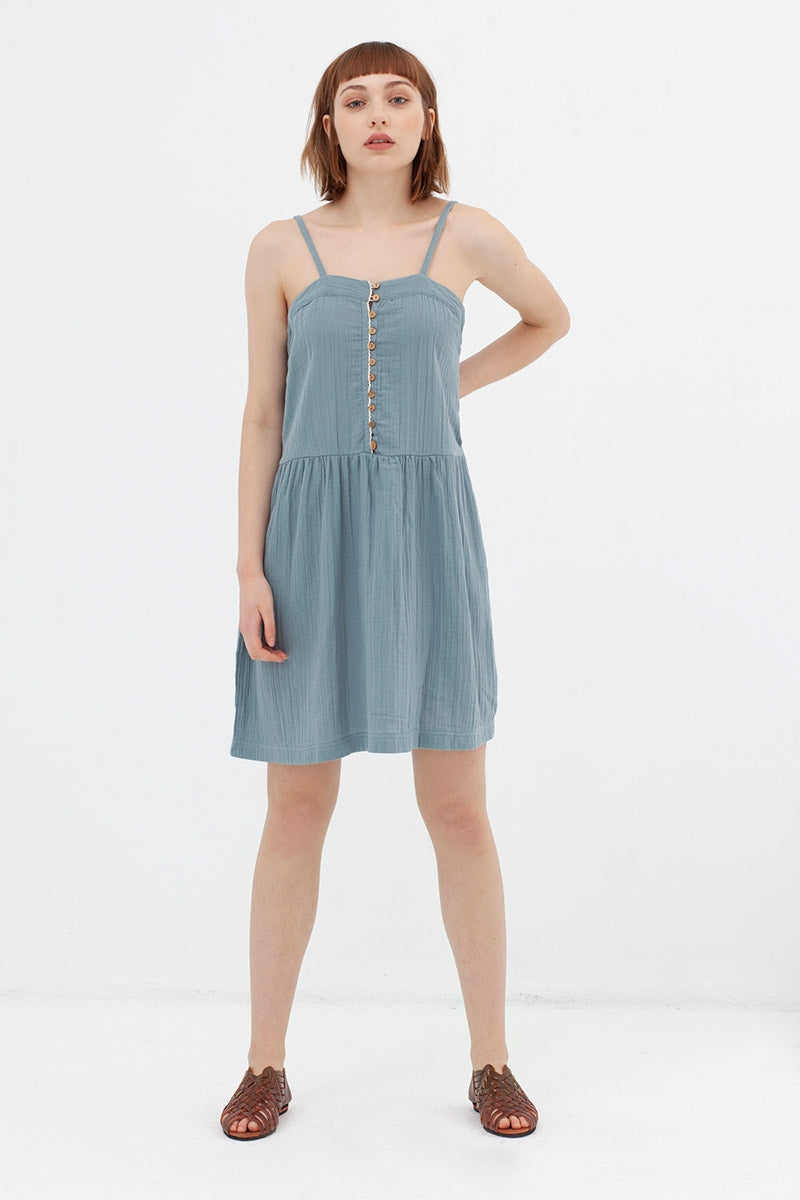 El vestido Ámbar color teja con corte charlestón, es una prenda romántica y delicada. Es un vestido holgado, fresco y cómodo con botones de coco funcionales y pasamanería. Está hecho con tejido de muselina. Este color lleva forro de algodón fino.
