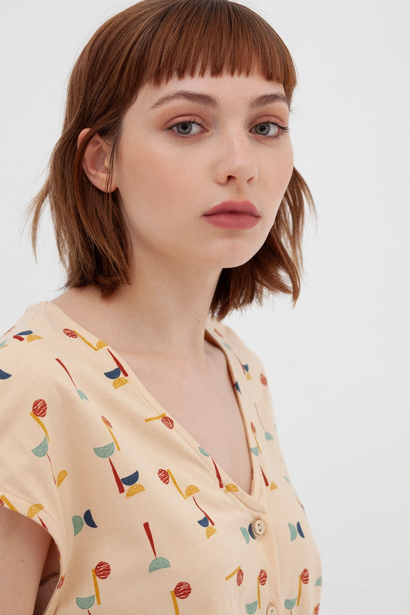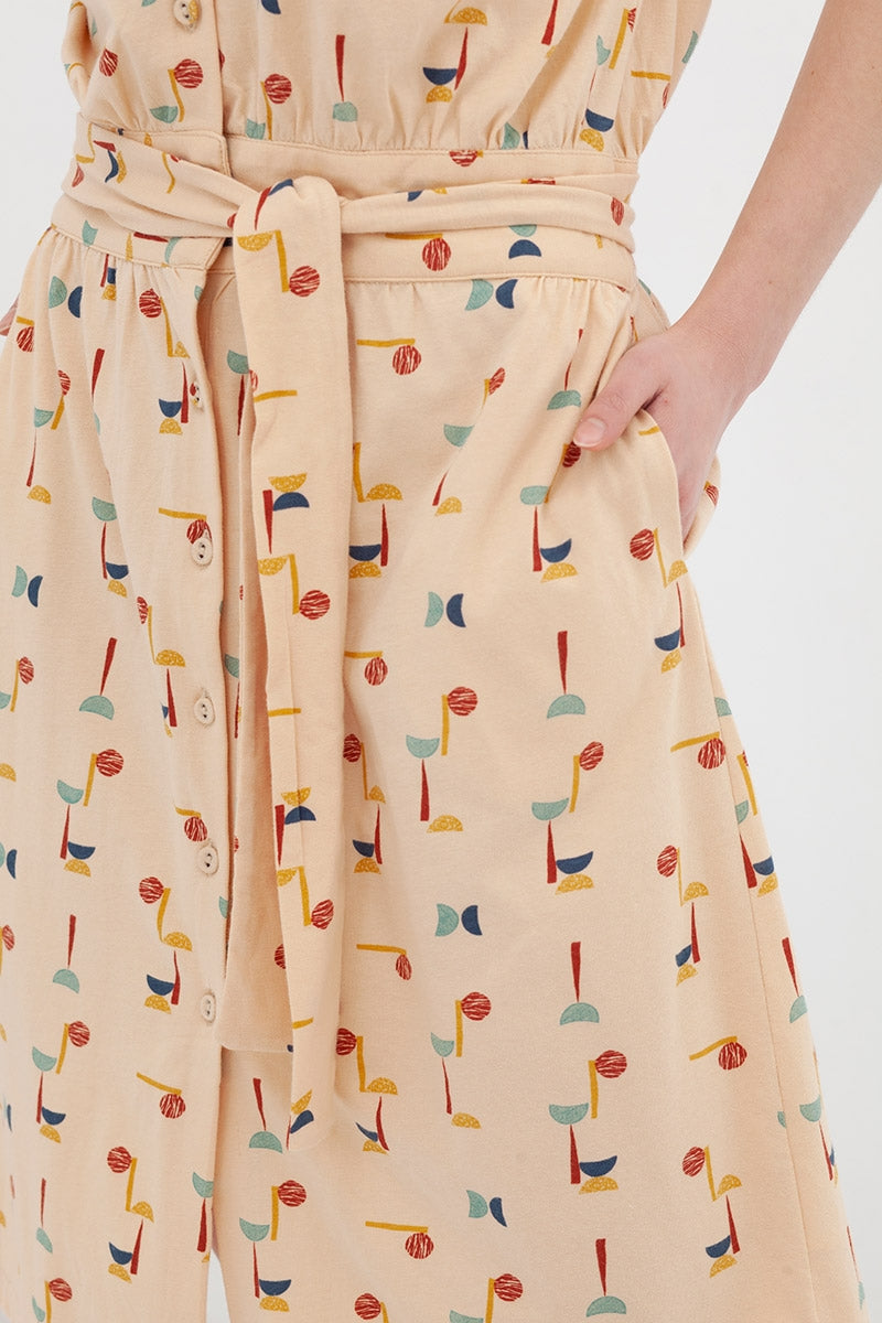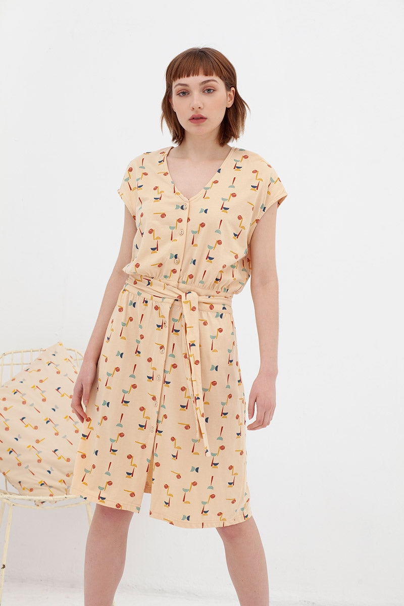 El vestido Amy con cuello pico y botones funcionales, lleva bolsillos laterales y un cinturón para adaptarlo a tu gusto. Es un vestido entallado a la cintura que a su vez estiliza la figura. El estampado abstracto multicolor inspirado en Lucienne day, le da ese toque especial, único y exclusivo a la prenda.