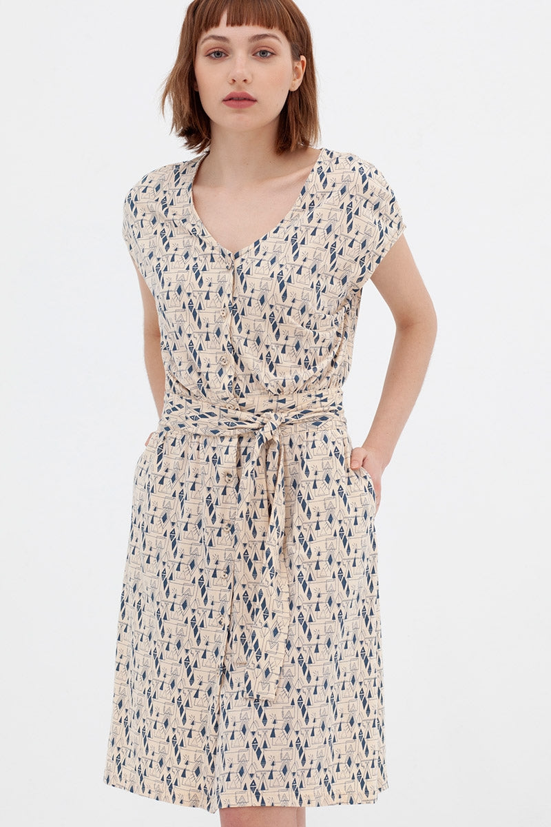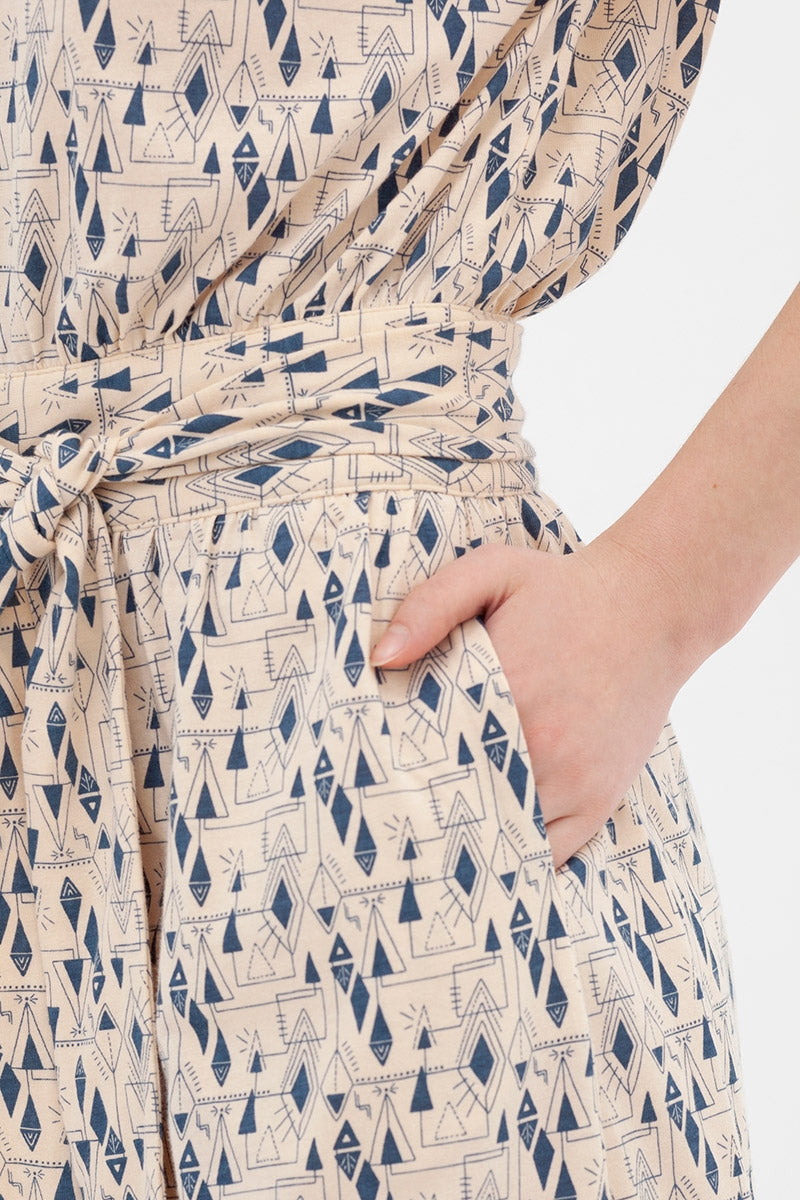 El vestido Amy con cuello pico y botones funcionales, lleva bolsillos laterales y un cinturón para adaptarlo a tu gusto. Es un vestido entallado a la cintura que a su vez estiliza la figura. El estampado de formas geométricas inspirado en Lucienne day, le da ese toque especial, único y exclusivo a la prenda.