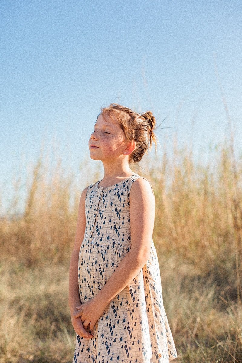 Este vestido es ya un»Classic» en nuestras colecciones. Esta vez le hemos añadido una tapeta con botones funcionales forrados del mismo tejido. Además, el precioso estampado geométrico hace que sea una prenda especial, única y muy original. Todas nuestras prendas están confeccionadas libres de tóxicos y son hipoalergénicas para la suave y delicada piel de tu pequeña. 100% algodón orgánico de Comercio Justo Certificado.