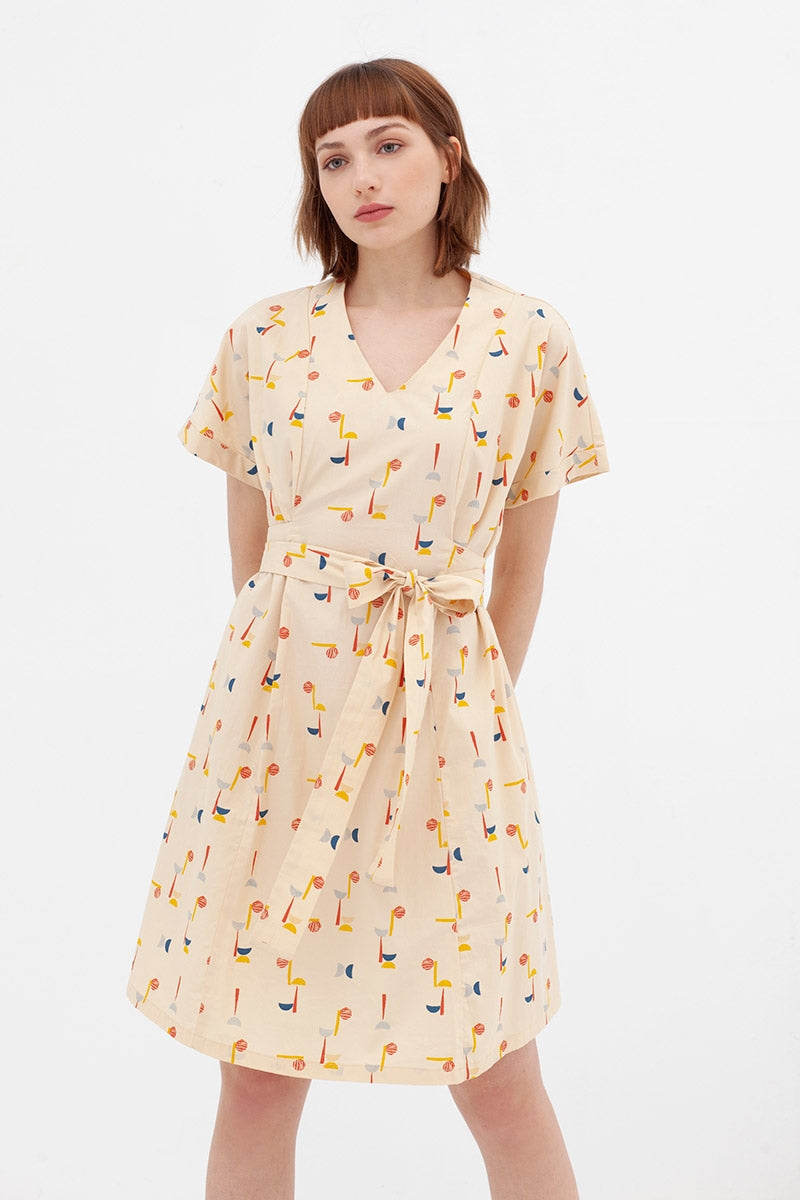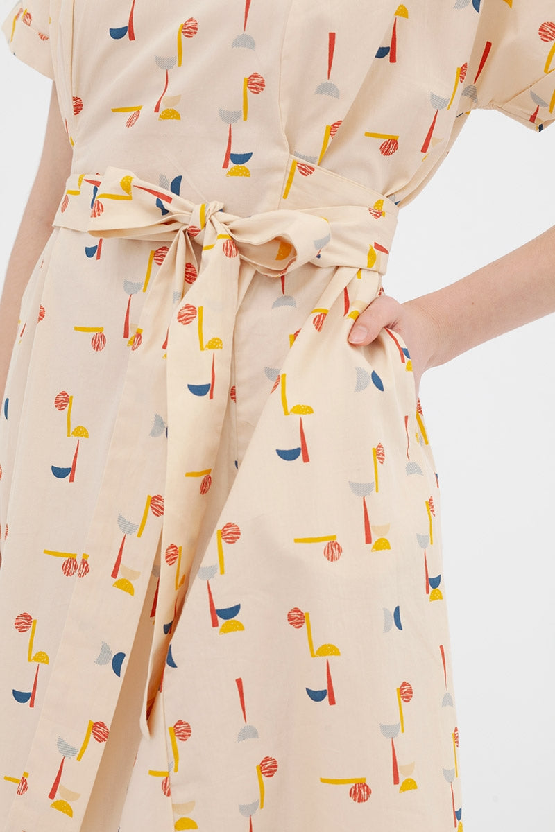 El vestido Amaya de corte japonés tiene un patrón ancho con un cinturón pudiéndolo ajustar a tu gusto. Está hecho con tejido de popelín de algodón súper fresco, suave y agradable al tacto. El estampado de abstracto inspirado en Lucienne day, le da ese toque especial, único y exclusivo a la prenda