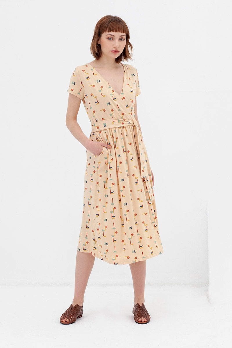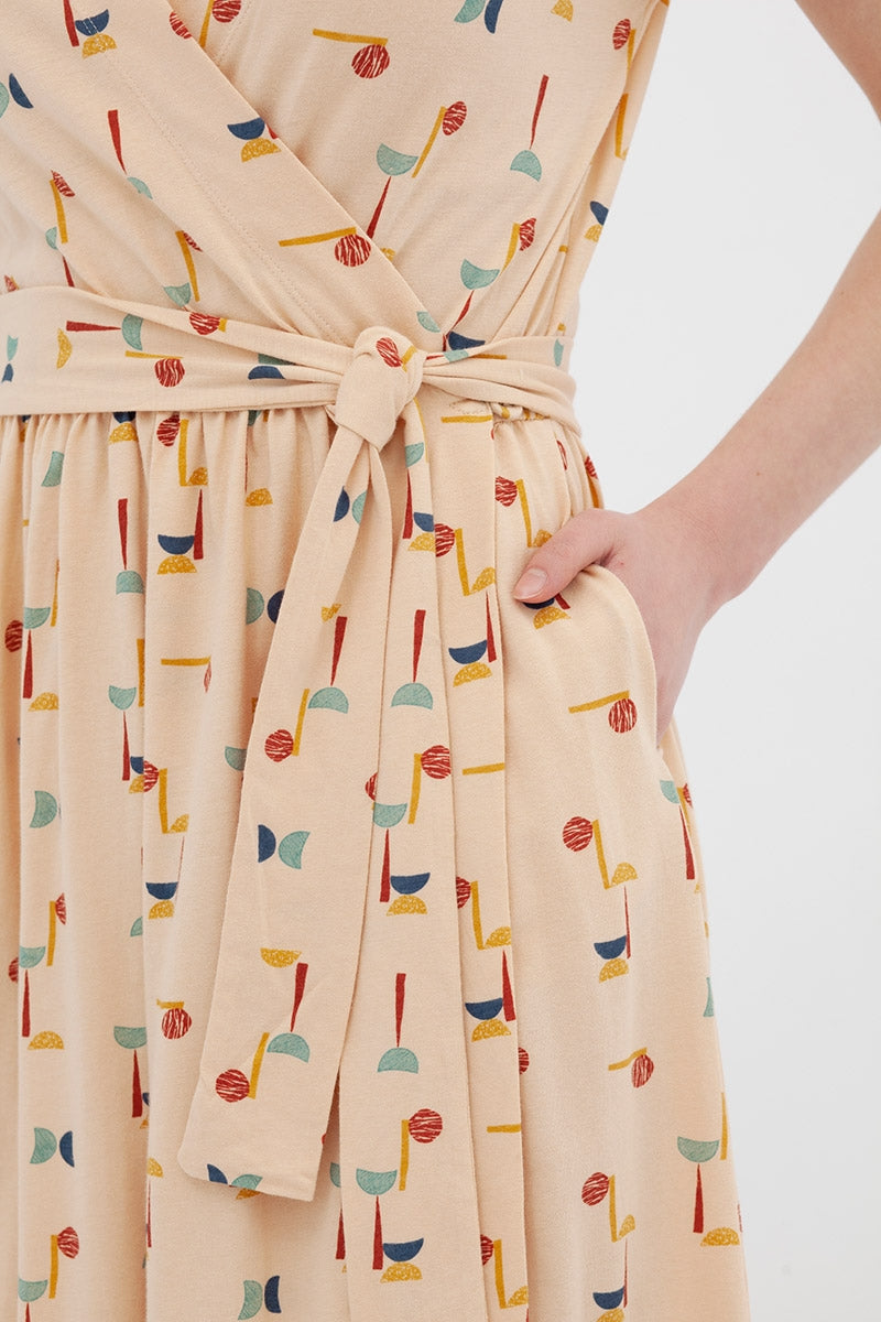 -El vestido Amelie cruzado es de lo más cómodo y elegante. Lleva bolsillos laterales y una goma en la cintura para mayor ajuste con un cinturón que podrás adaptar a tu gusto. Es una prenda que podrás usar durante el embarazo y para dar el pecho. El estampado abstracto multicolor inspirado en Lucienne day, le da ese toque especial, único y exclusivo a la prenda.
