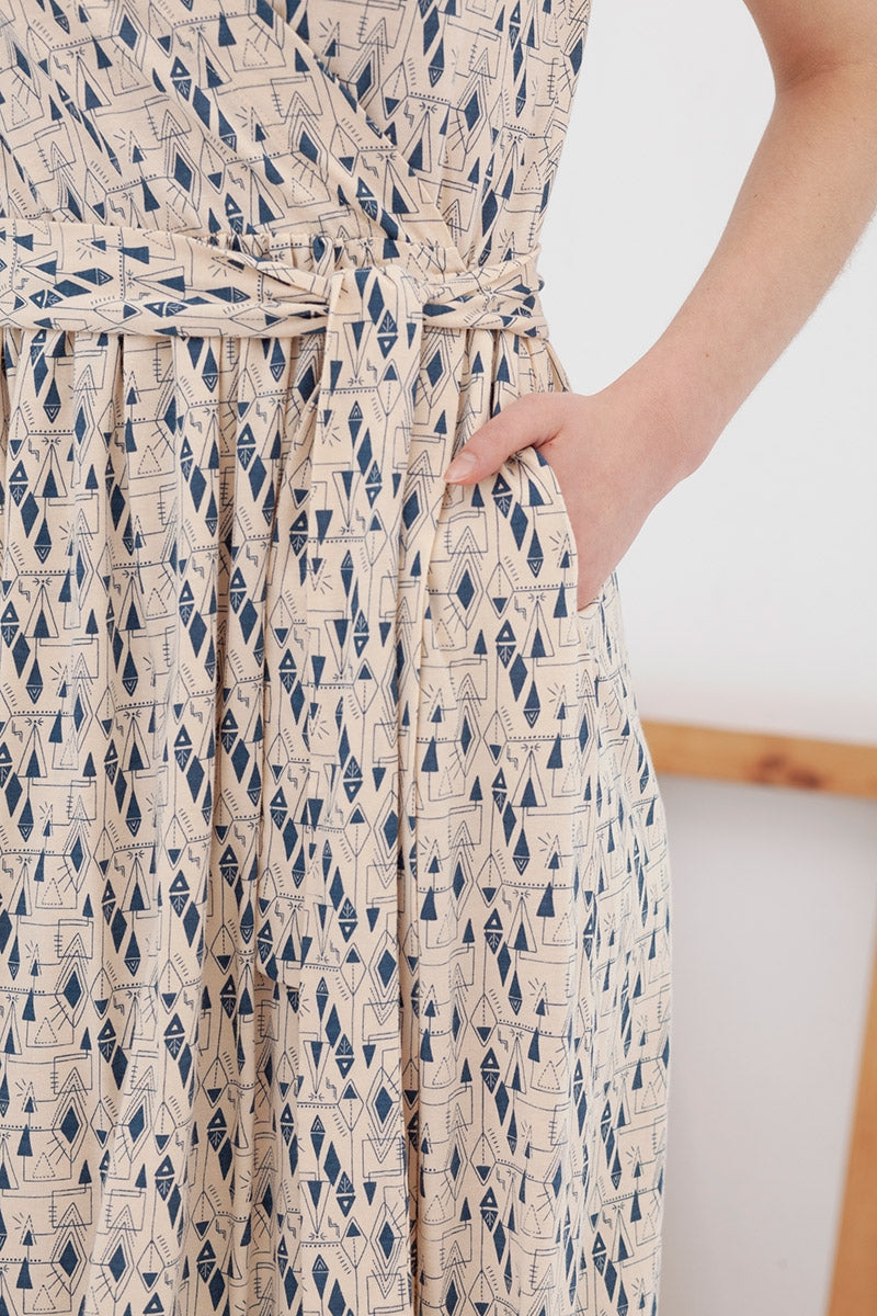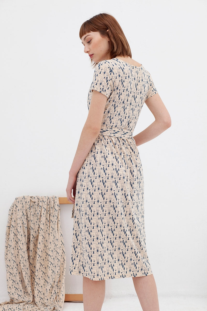 -El vestido Amelie cruzado es de lo más cómodo y elegante. Lleva bolsillos laterales y una goma en la cintura para mayor ajuste con un cinturón que podrás adaptar a tu gusto. Es una prenda que podrás usar durante el embarazo y para dar el pecho. El estampado con motivos geométricos inspirado en Lucienne day, le da ese toque especial, único y exclusivo a la prenda.