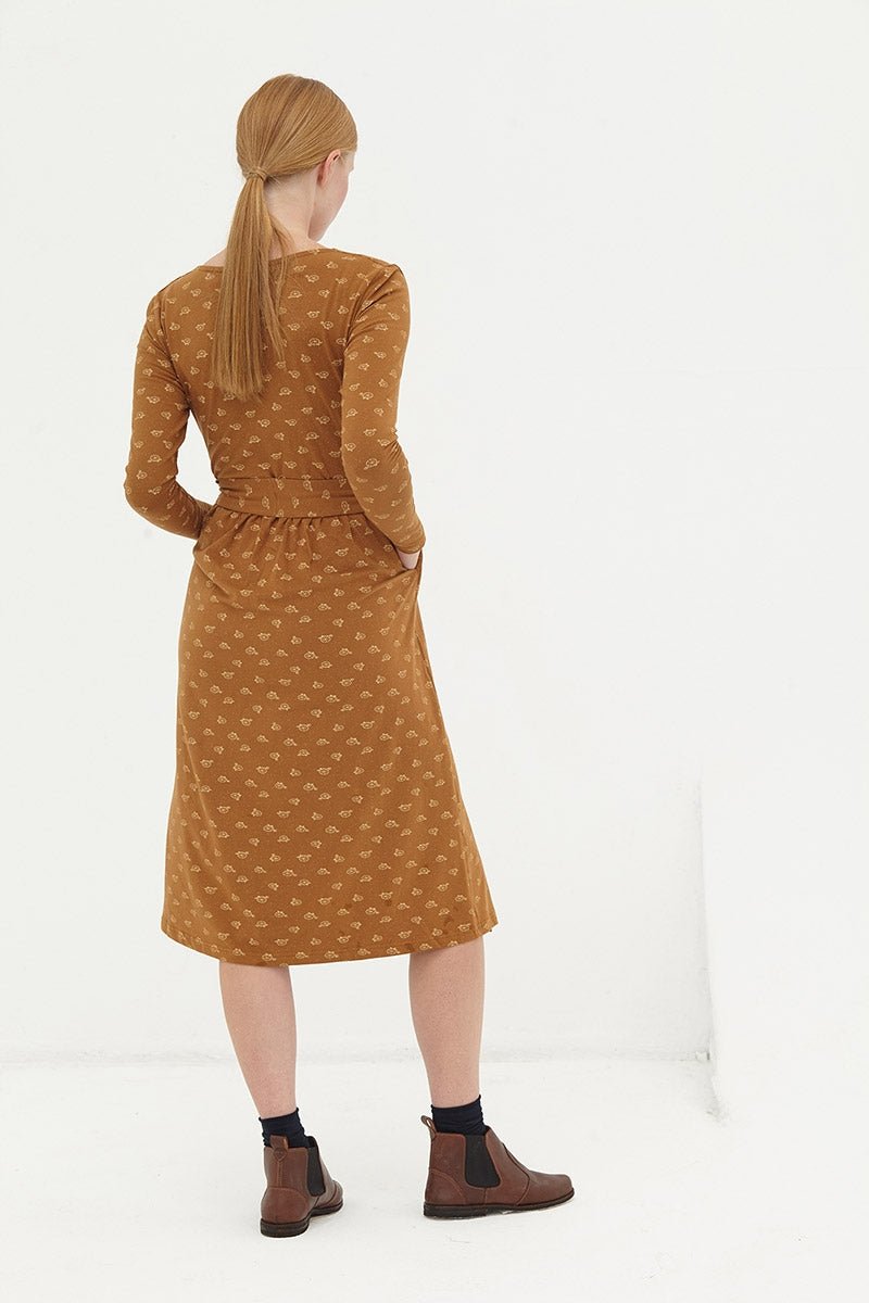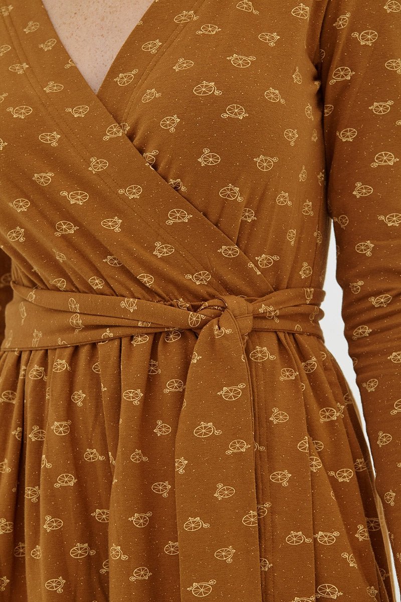 El vestido Dana cruzado es de lo más cómodo y elegante. Lleva bolsillos laterales y una goma en la cintura para mayor ajuste con un cinturón que podrás adaptar a tu gusto. Es una prenda que podrás usar durante el embarazo y para dar el pecho. El estampado de bicicletas marrón inspirado en Circus, le da ese toque especial a la prenda.