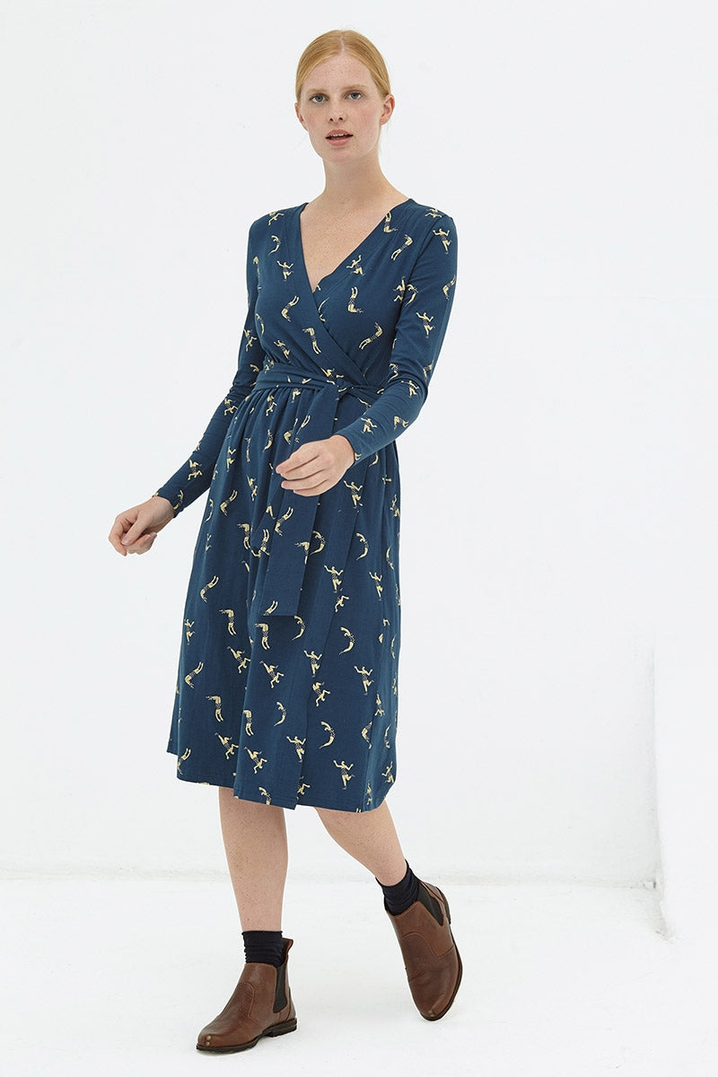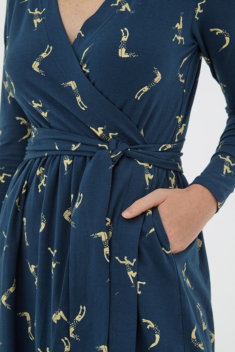 El vestido Dana cruzado es de lo más cómodo y elegante. Lleva bolsillos laterales y una goma en la cintura para mayor ajuste con un cinturón que podrás adaptar a tu gusto. Es una prenda que podrás usar durante el embarazo y para dar el pecho. El estampado de acróbatas azul marino inspirado en Circus, le da ese toque especial a la prenda.