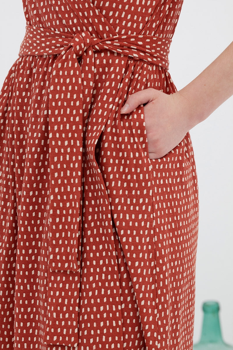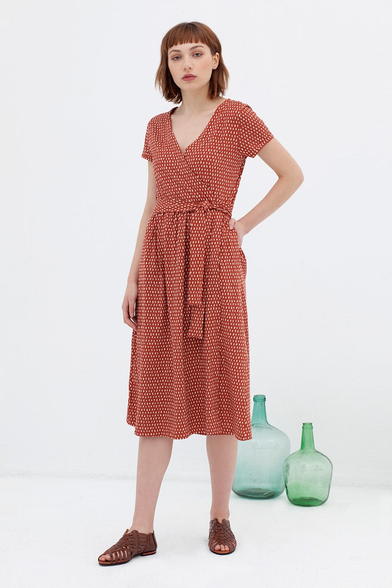 -El vestido Amelie cruzado es de lo más cómodo y elegante. Lleva bolsillos laterales y una goma en la cintura para mayor ajuste con un cinturón que podrás adaptar a tu gusto. Es una prenda que podrás usar durante el embarazo y para dar el pecho. El color teja con estampado inspirado en Lucienne day, le da ese toque especial, único y exclusivo a la prenda..