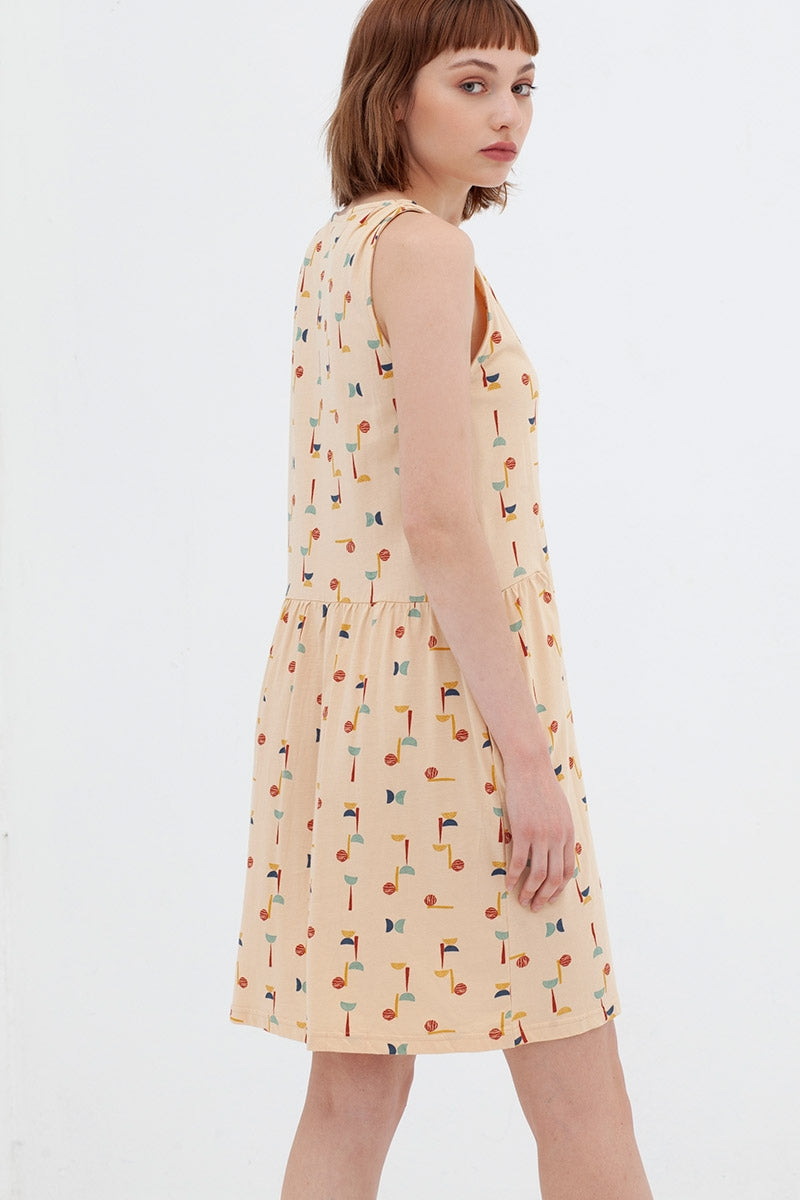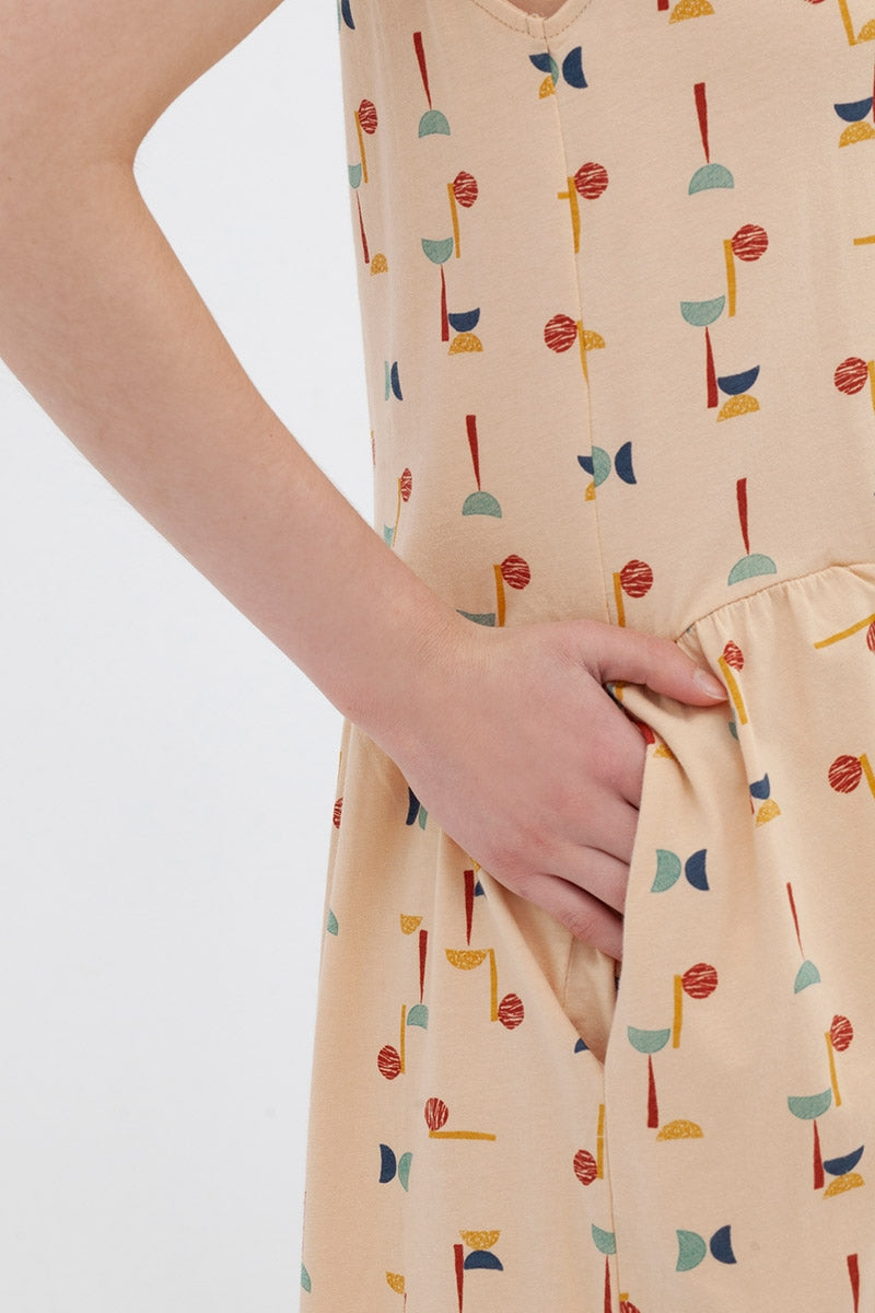 El vestido Andres camisero con cuello V lleva botones funcionales y bolsillos laterales. Es un vestido ancho, fresco y muy cómodo de llevar. El estampado abstarcto multicolor inspirado en Lucienne day, le da ese toque especial, único y exclusivo a la prenda.