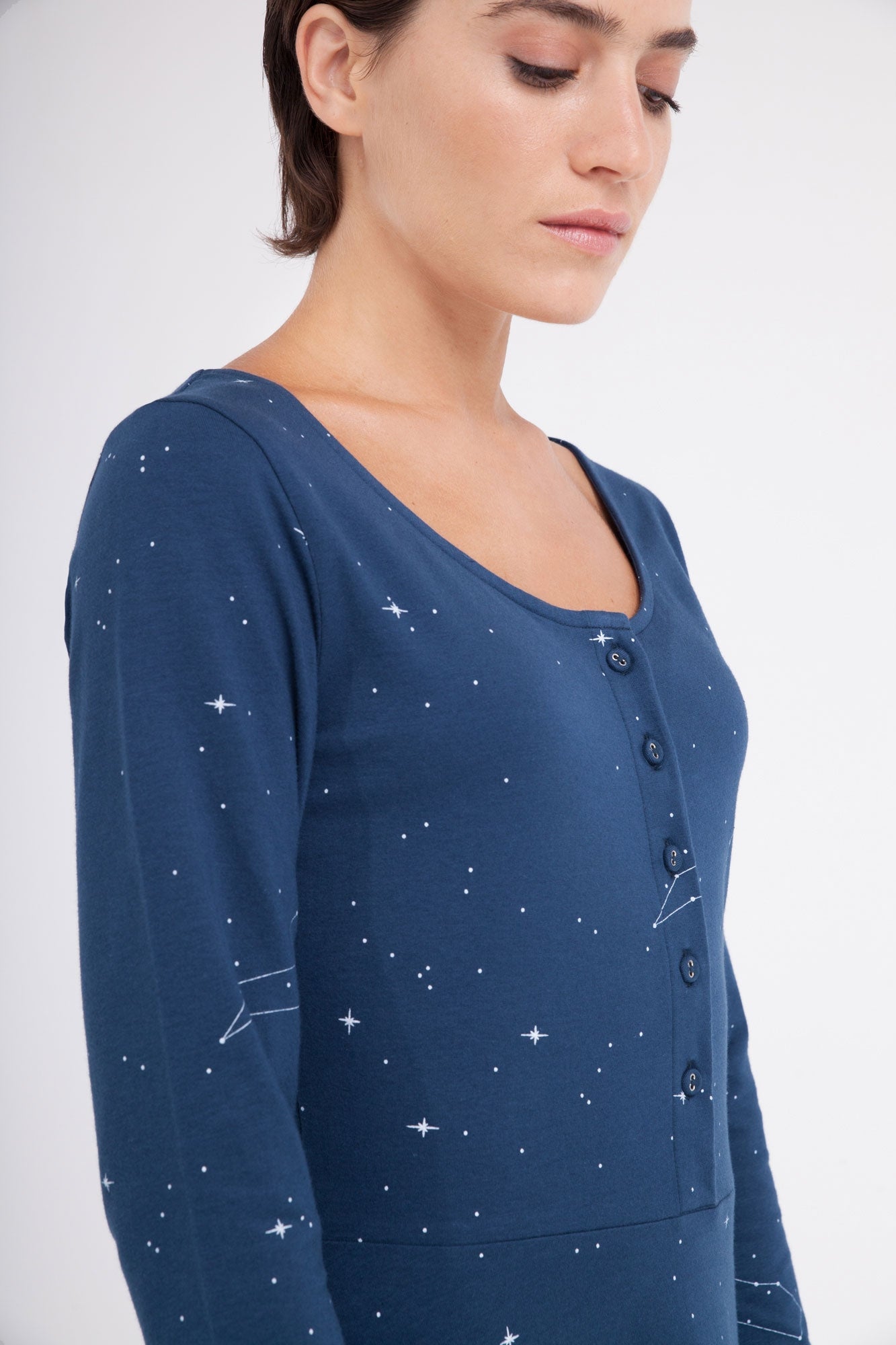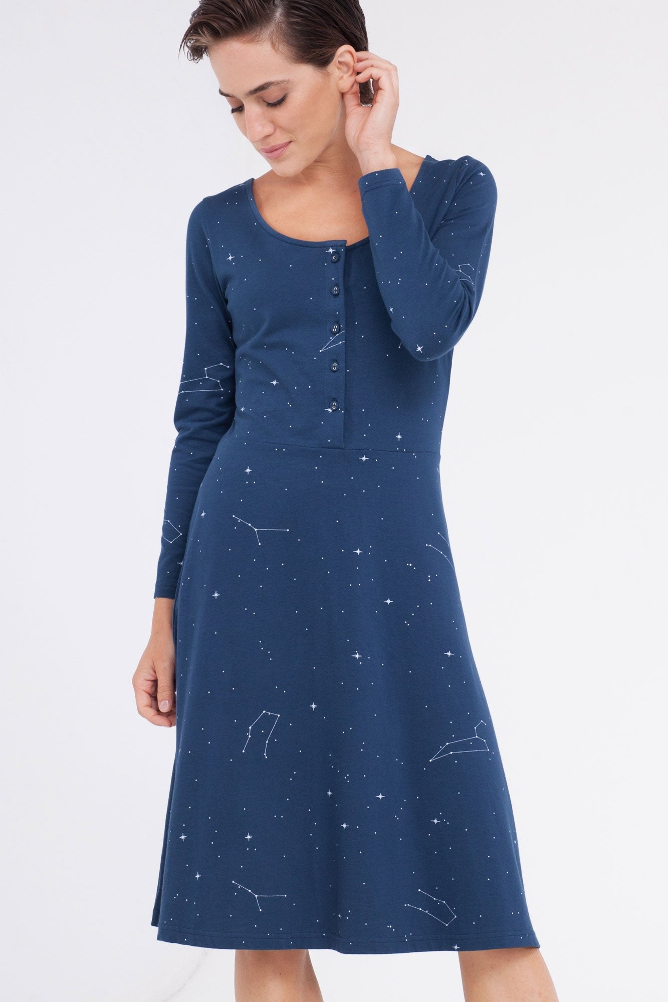 El vestido Cynthia con estampado de constelaciones tiene un corte en la cintura precioso que ayuda a estilizar la figura. El largo midi de la falda es ideal y muy cómodo. También lleva tapeta con botones funcionales que van muy bien si estás dando el pecho.Ropa de mujer ecológica confeccionada en algodón orgánico GOTS de comercio justo.