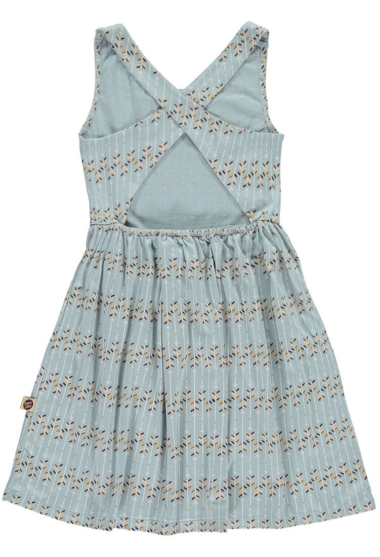 Vestido con tirantes cruzados en color azul con estampado de flachas multicolor. 100% algodón orgánico de Comercio Justo Certificado.