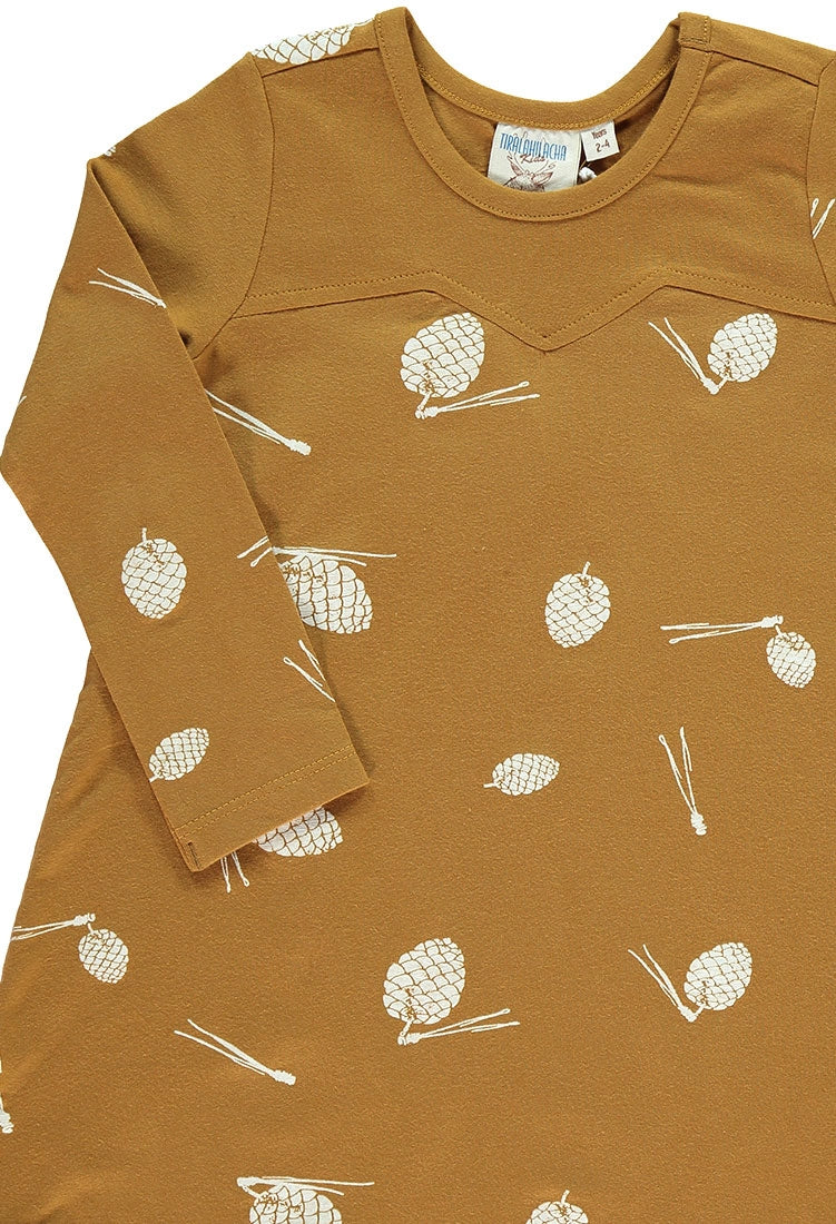 Vestido evasé y canseú en color mostaza con estampado piñas. 5% Lycra 95% algodón orgánico de Comercio Justo Certificado.