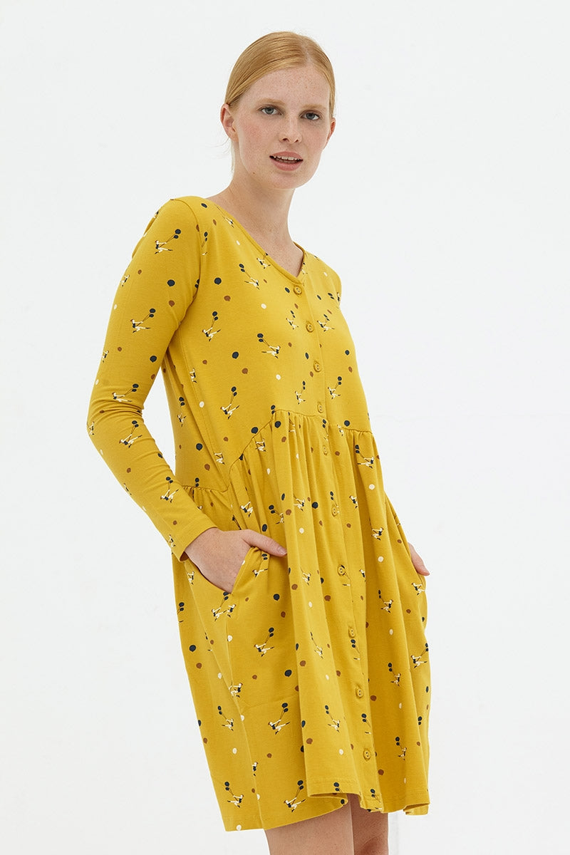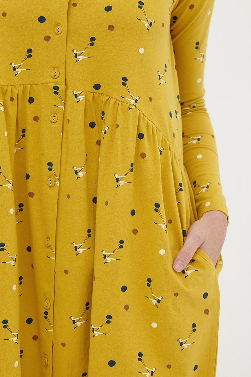 El vestido Daniela es holgado y muy cómdo. Tiene bolsillos laterales y y botones funcionales. Tiene un corte perfecto para llevar durante el embarazo y para dar el pecho. El estampado con trapecistas mostaza inspirado en Circus, le da ese toque especial, único y exclusivo a la prenda.