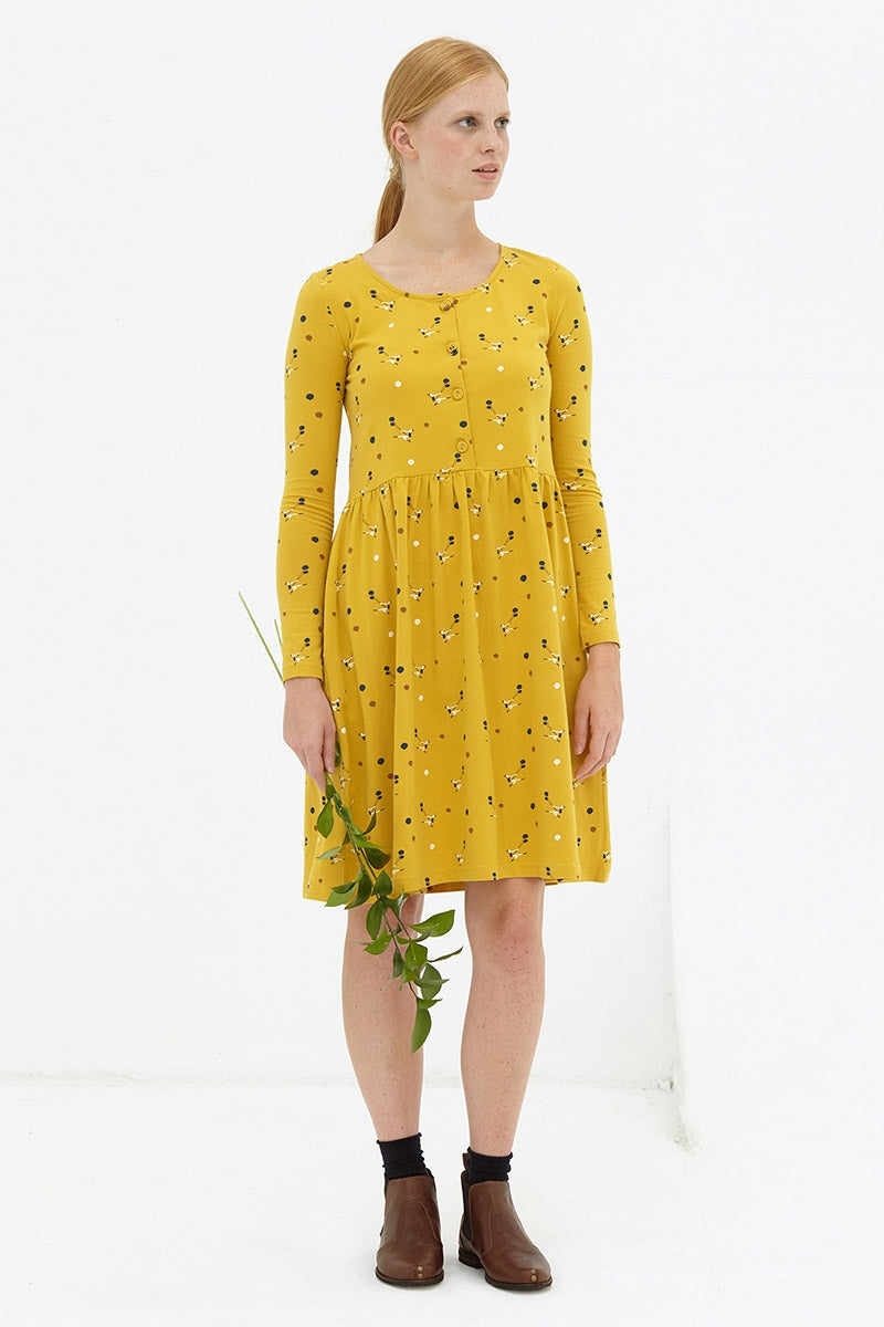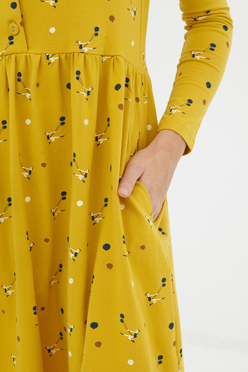 El vestido holgado Dayanna lleva botones funcionales y bolsillos laterales. Un vestido cómodo y un básico en nuestras colecciones. El color mostaza con estampado de ttrapecistas inspirado en Circus, le da ese toque especial, único y exclusivo a la prenda.