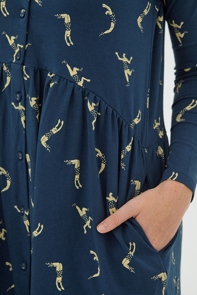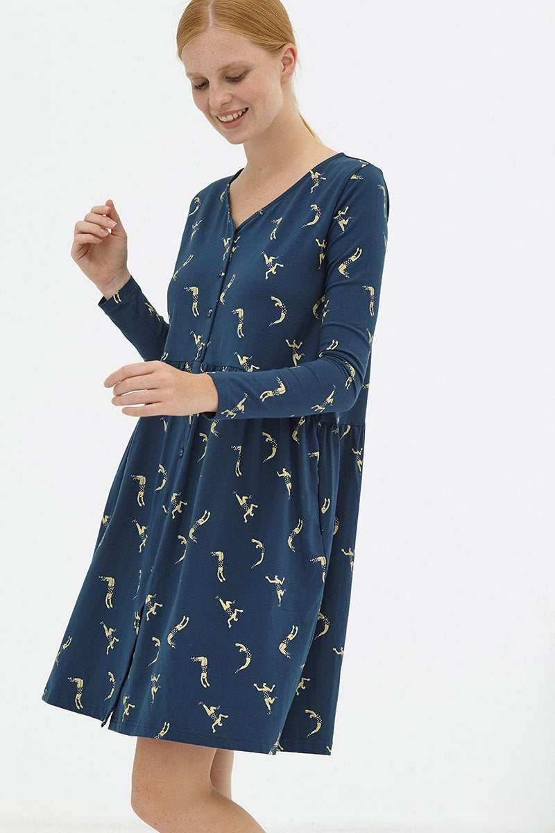 El vestido Daniela es holgado y muy cómodo. Tiene bolsillos laterales y botones funcionales. Tiene un corte perfecto para llevar durante el embarazo y para dar el pecho. El estampado con acróbatas azul inspirado en Circus, le da ese toque especial, único y exclusivo a la prenda.