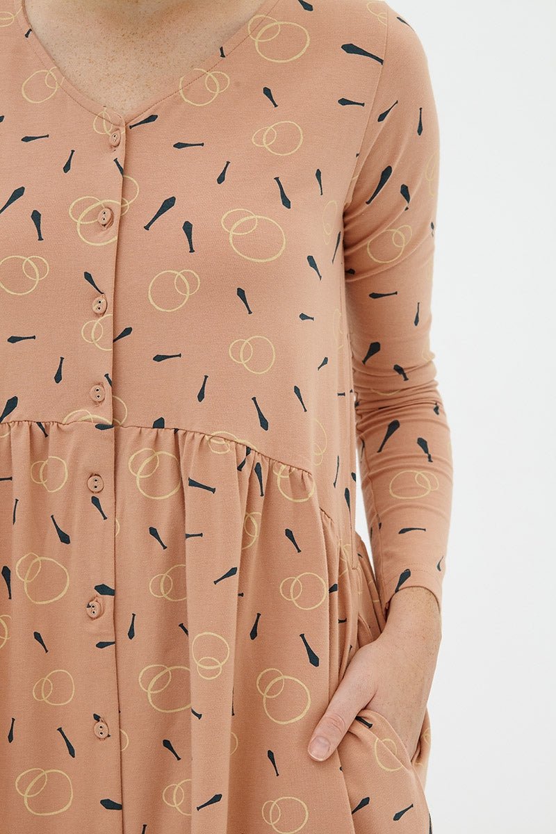 El vestido Daniela es holgado y muy cómodo. Tiene bolsillos laterales y y botones funcionales. Tiene un corte perfecto para llevar durante el embarazo y para dar el pecho. El estampado con malabares rosa pastel inspirado en Circus, le da ese toque especial, único y exclusivo a la prenda.