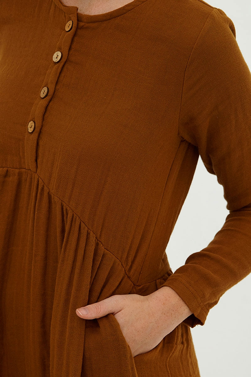 El vestido largo Dara marrón chocolate de nuestra colección «Basics Tiralahilacha» es un vestido cálido y envolvente. Una prenda holgada con corte imperio. Tiene botones funcionales de coco y bolsillos laterales. Es ligero y muy agradable al tacto por su tejido de muselina, sobre todo después del primer lavado. Prendas lisas y atemporales que complementarán tu armario sostenible muchos años