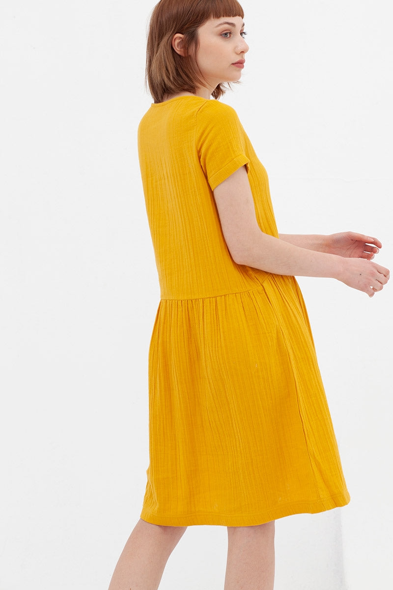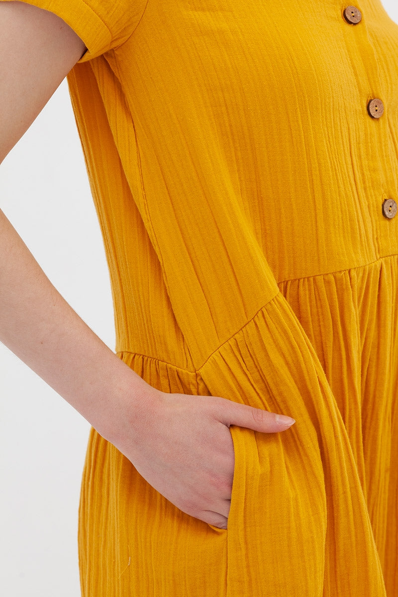 El vestido Almudena mostaza, es una prenda romántica y delicada. Es un modelo holgado y lleva tapeta con botones de coco funcionales y bolsillos en el lateral. Está hecho con tejido de muselina.