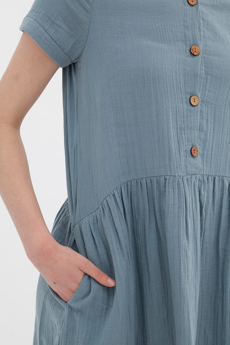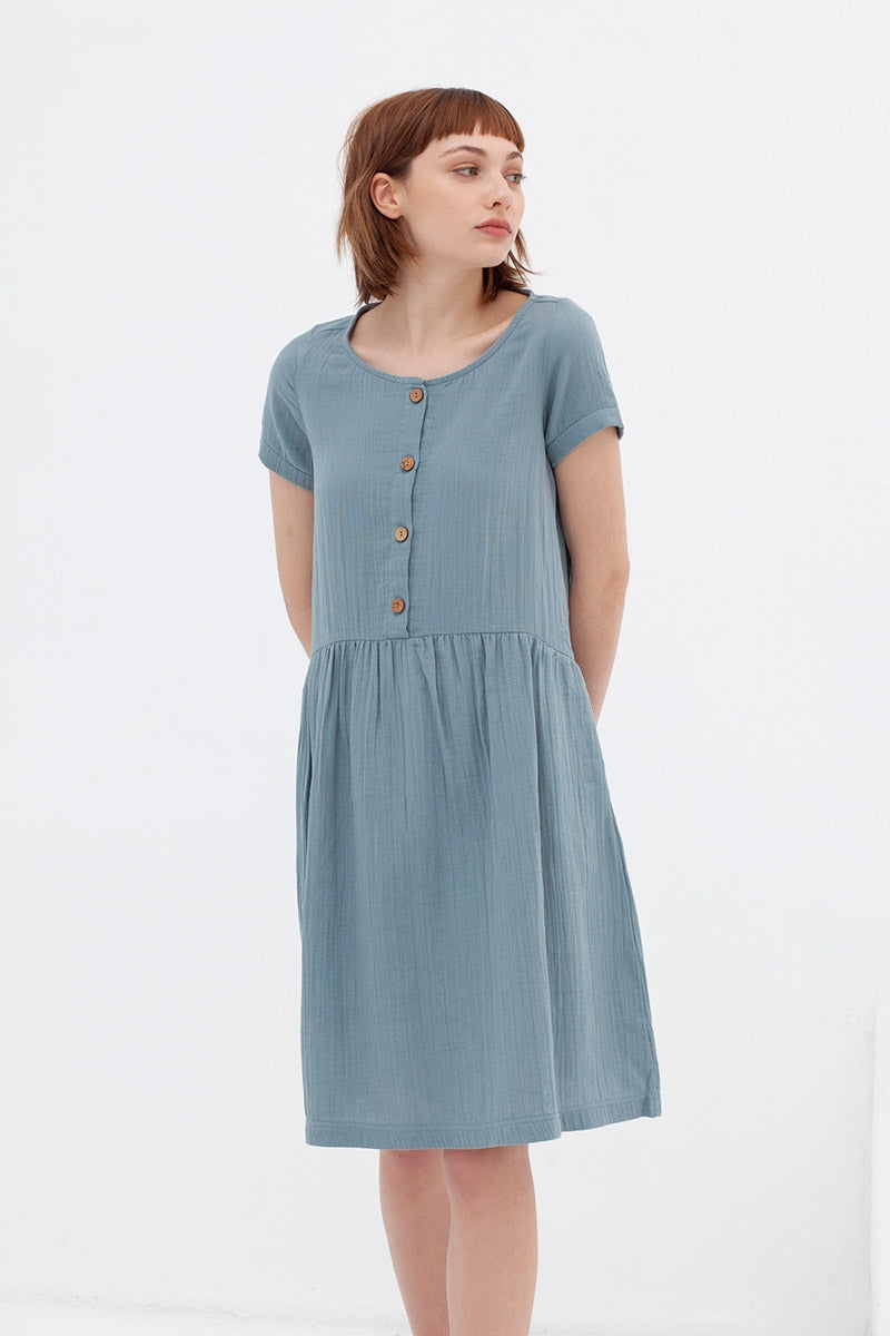 El vestido Almudena color teja, es una prenda romántica y delicada. Es un modelo holgado y lleva tapeta con botones de coco funcionales y bolsillos en el lateral. Está hecho con tejido de muselina y este color lleva forro de algodón fino para evitar transparencias.
