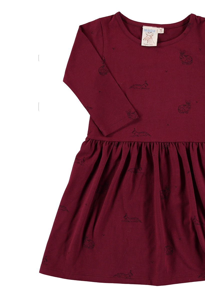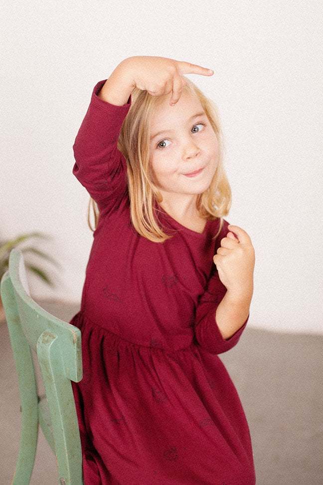 Vestido de manga larga granate estampado. 100% algodón orgánico de Comercio Justo Certificado.