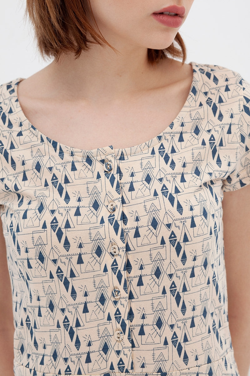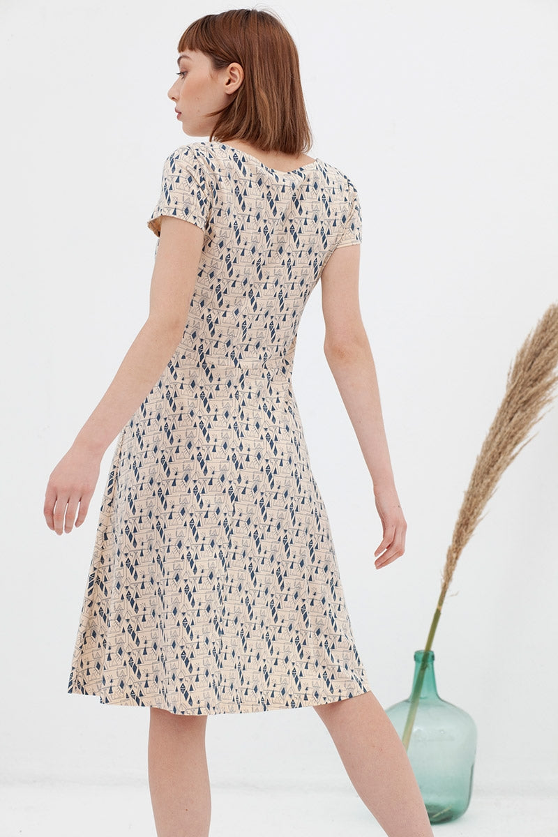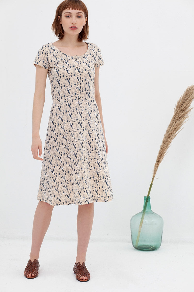 El vestido Ara con falda media capa y corte en la cintura es entallado y estiliza la figura.Tiene tapeta con botones funcionales y manga corta. lleva tapeta con botones funcionales y manga corta. El estampado con motivos geométricos inspirado en Lucienne day, le da ese toque especial, único y exclusivo a la prenda.