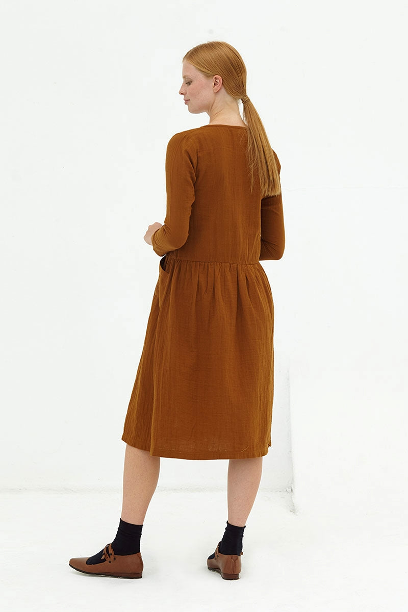 El vestido Dustyn marrón chocolate de nuestra colección «Basics Tiralahilacha» es una prenda holgada con un corte muy cómodo y favorecedor, es un vestido que te enamorará. Tiene botones funcionales de coco y bolsillos de plastón. Es ligero y muy agradable al tacto por su tejido de muselina, sobre todo después del primer lavado. Prendas lisas y atemporales que complementarán tu armario sostenible muchos años.