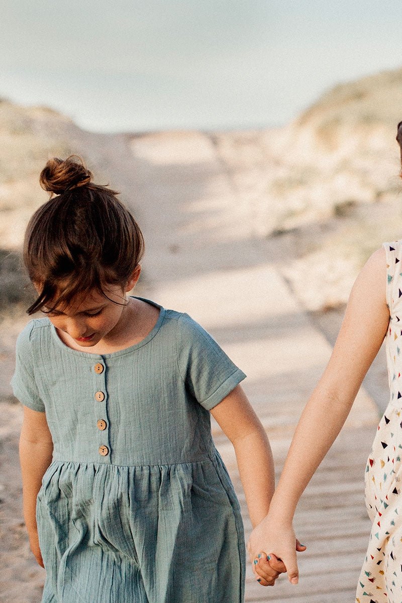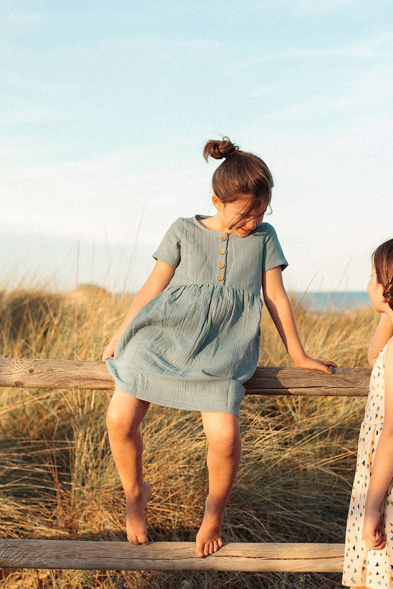 Vestido holgado manga corta de muselina. Una prenda cómoda y muy suave al tacto en un precioso color azul vintage. Lleva botones funcionales de coco. Todas nuestras prendas están confeccionadas libres de tóxicos y son hipoalergénicas para la suave y delicada piel de tu pequeña.