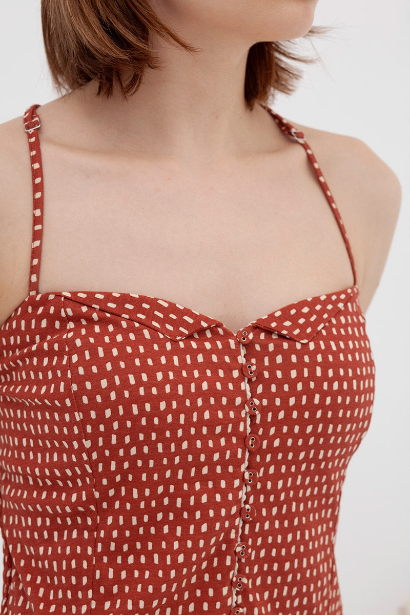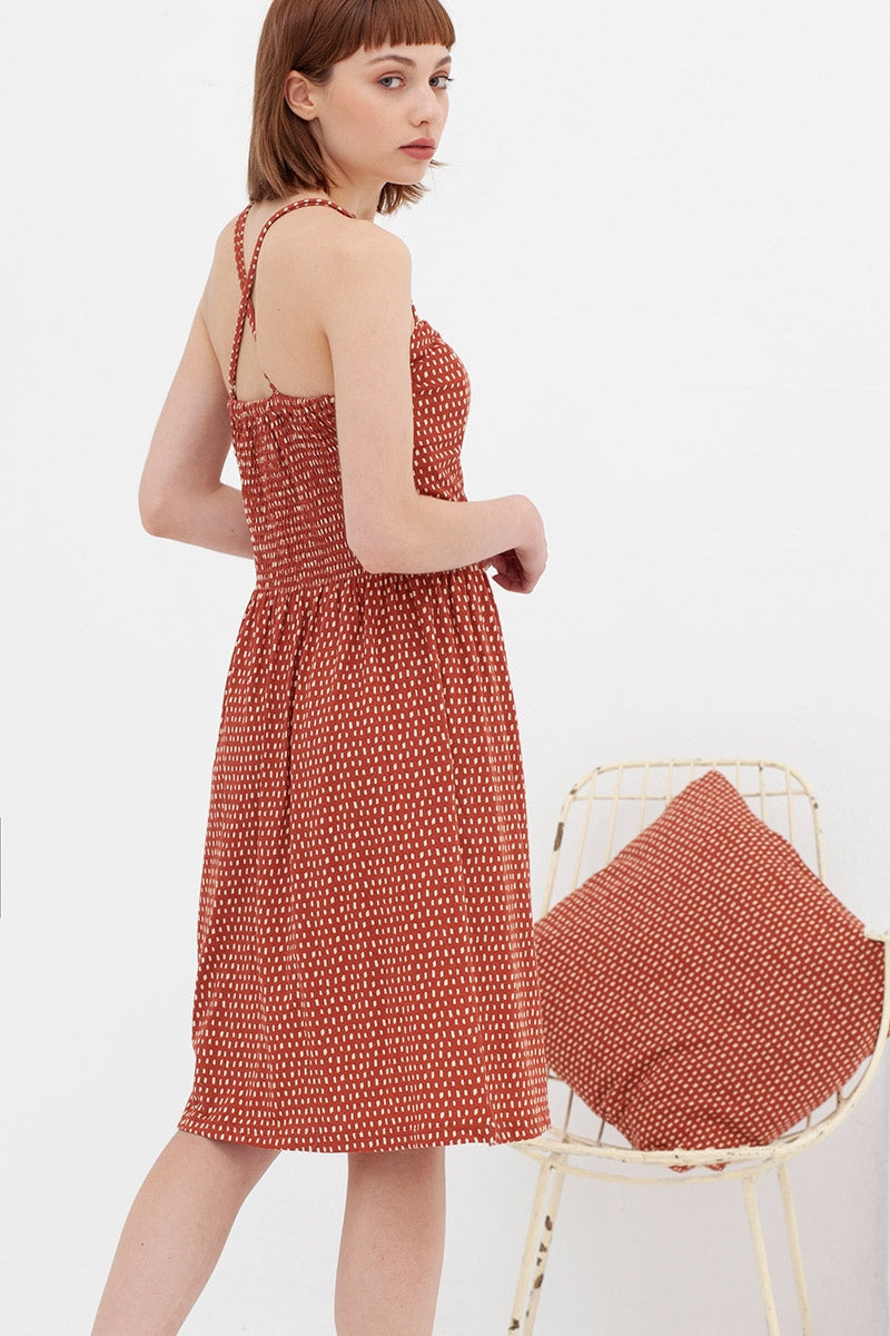 El vestido Adara con aire retro es ideal para los días de calor. Lleva tirantes cruzados regulables y nido de abeja en la espalda para mayor ajuste. Es un vestido con corte en la cintura y entallado. Lleva botones funcionales con detalle de una pasamanería. El color teja con estampado inspirado en Lucienne day, le da ese toque especial, único y exclusivo a la prenda.