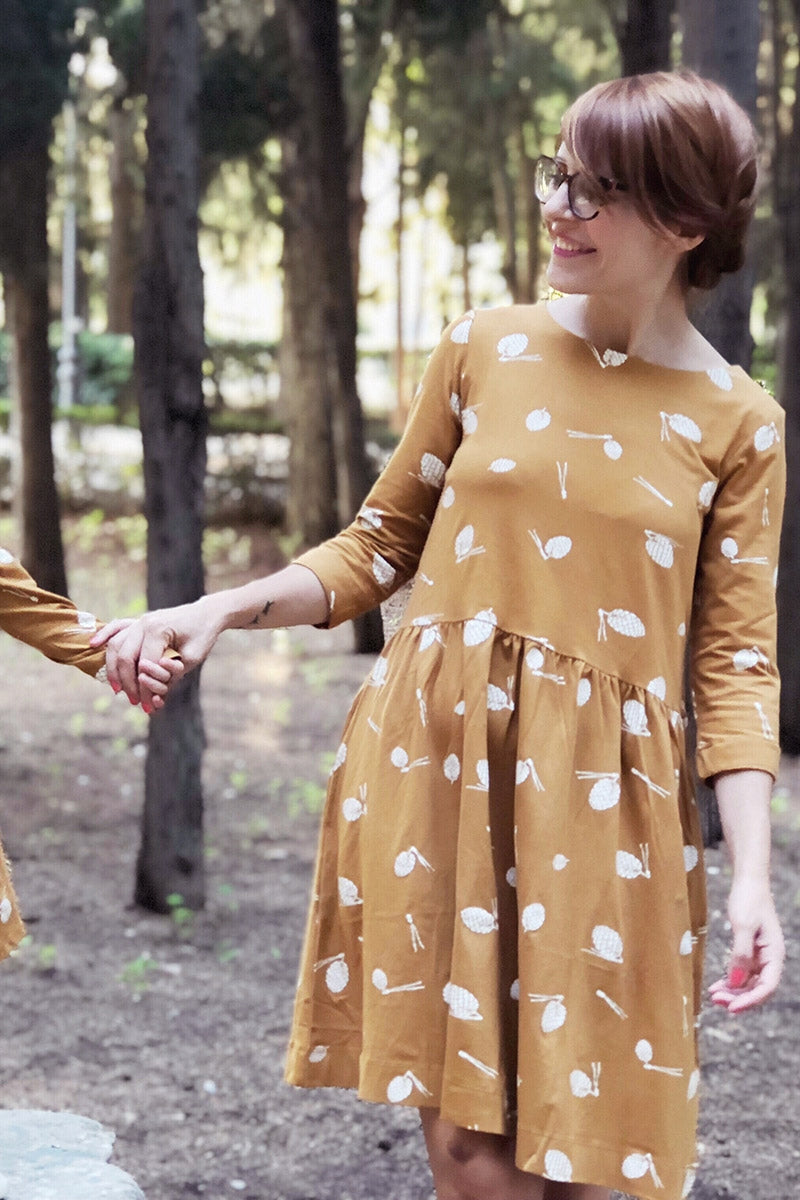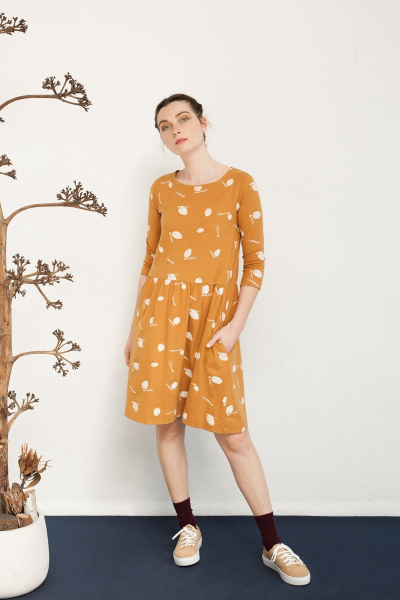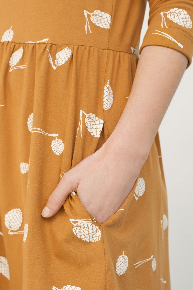 Vestido oversize con bolsillos en mostaza con estampado piñas. Ropa de mujer ecológica confeccionada en algodón orgánico GOTS de comercio justo.