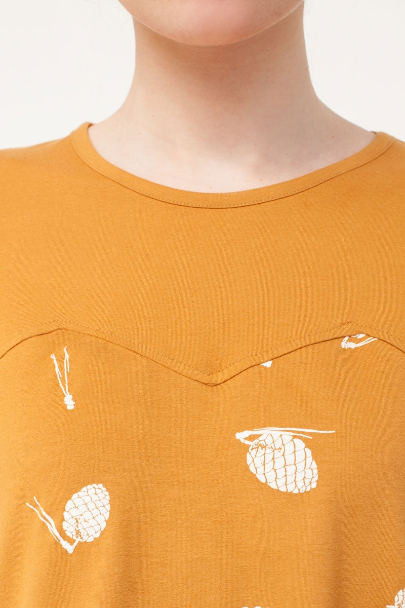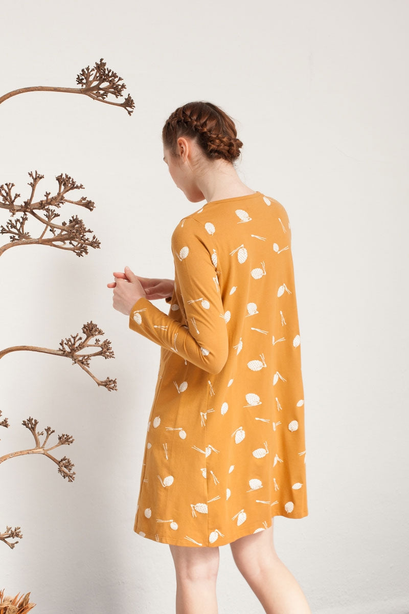 Vestido evasé con canesú en mostaza con estampado piñas. Ropa de mujer ecológica confeccionada en algodón orgánico GOTS de comercio justo.