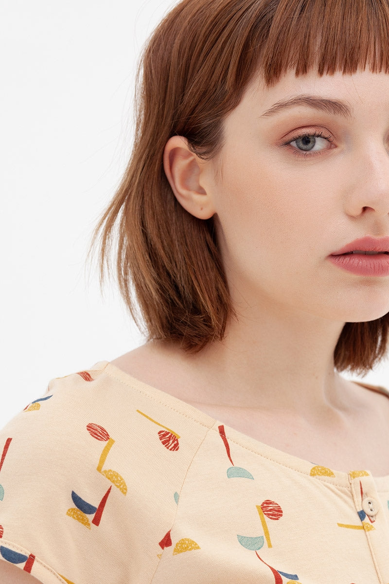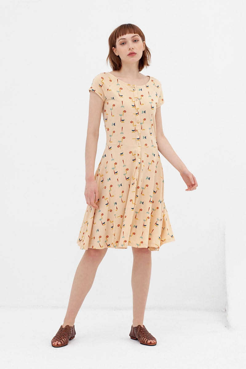 El vestido Àdele con aire retro y manga ranglán, tiene corte en la cintura y es entallado. Lleva tapeta con botones funcionales. El estampado abstracto multicolor inspirado en Lucienne day, le da ese toque especial, único y exclusivo a la prenda.